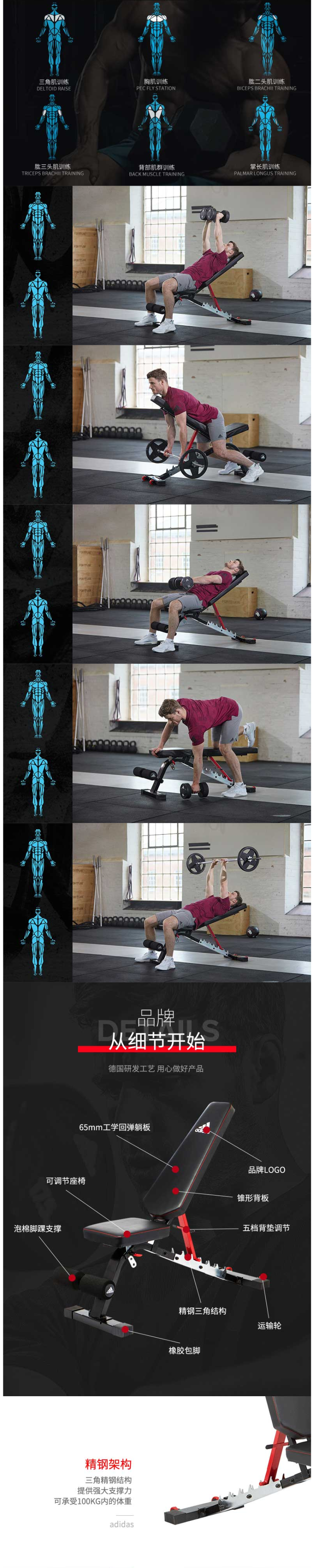 这款阿迪达斯多功能卧推凳,适合三角肌训练、胸肌训练、肱二头肌训练、肱三头肌训练、背部肌群训练、掌长肌训练。三角精钢结构,能提供强大支撑力,可承受100kg内的体重。
