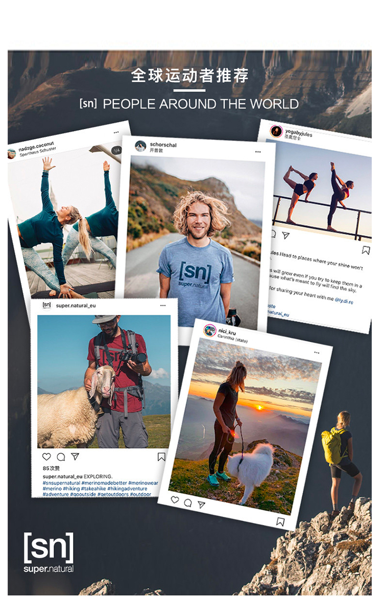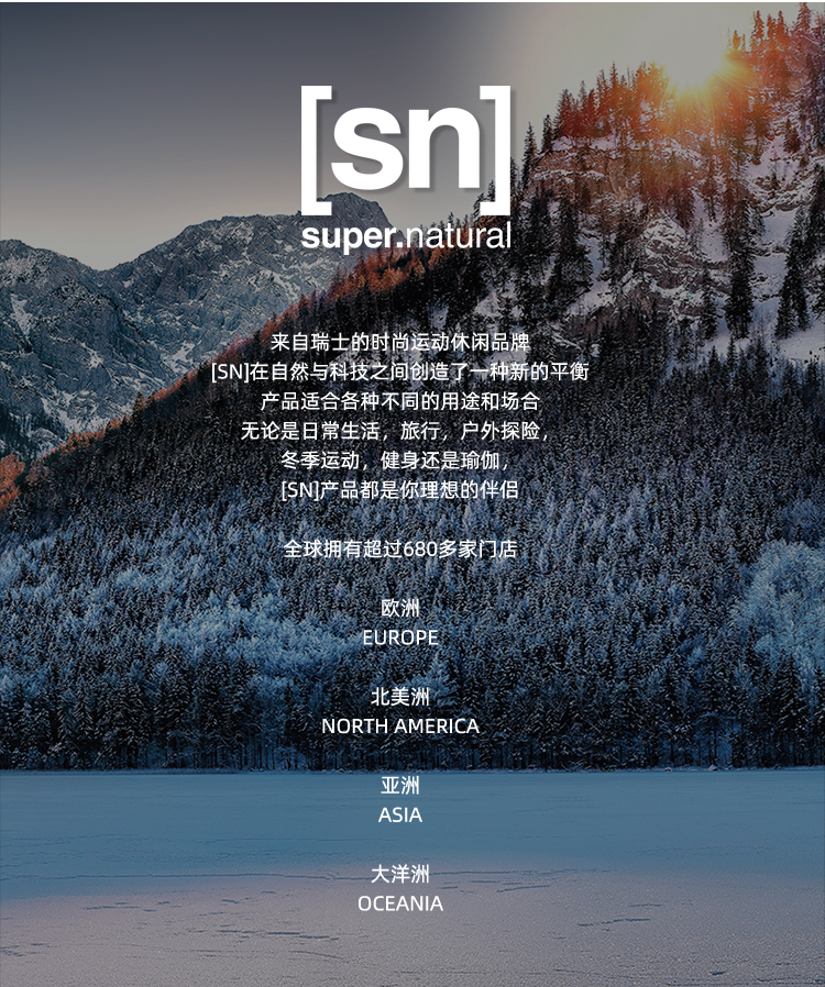 [SN]是Super.Natural的缩写,是一个来自瑞士的时尚运动休闲品牌,专注于城市运动和时尚休闲服装。其产品设计均来自欧洲,而面料则是其品牌的核心组成部分,注重高科技面料带来的衣着感受,在全球拥有超过680多家门店。