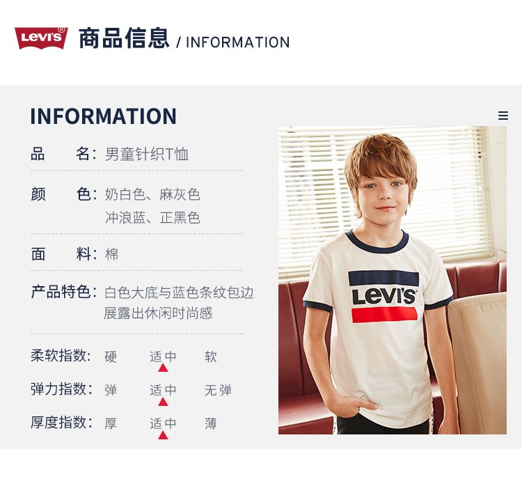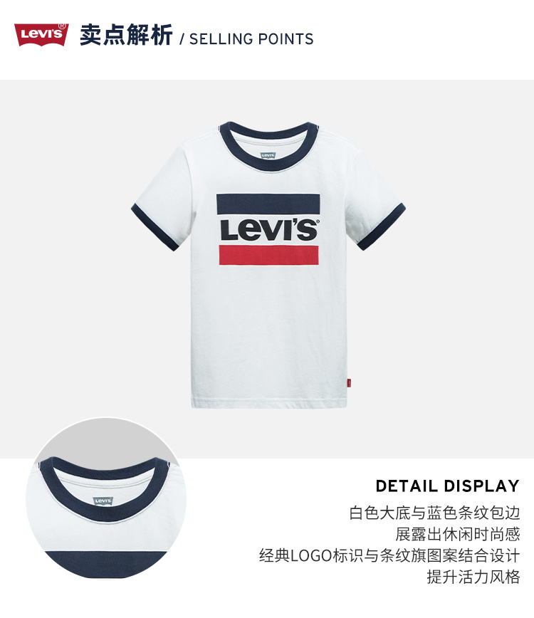 这款Levi's 李维斯 2021年夏季新款男中大童LOGO款休闲时尚短袖T恤,使用全棉质地,亲肤透气,柔软舒适,基础款圆领贴边,美观且易于穿脱;经典LOGO标识与条纹旗图案结合,设计醒目,彰显质感;白色大底与蓝色条纹包边,展露出休闲时尚感。