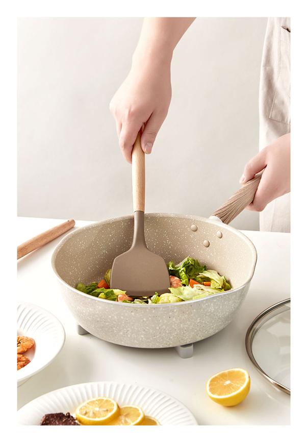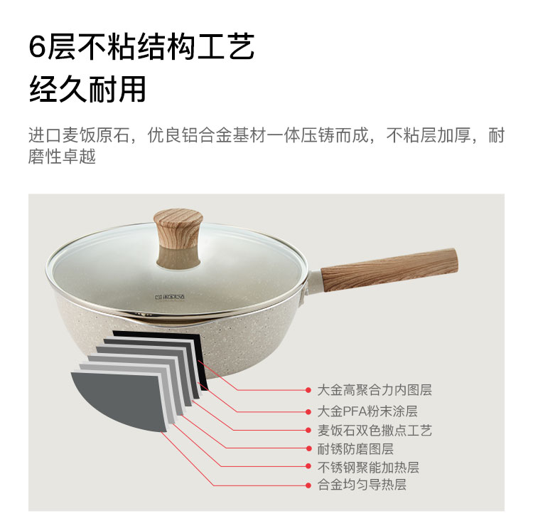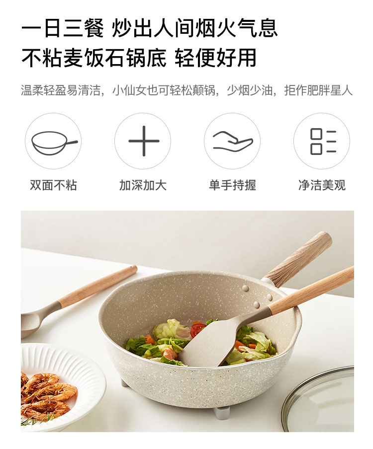 这款淘宝心选麦饭石不粘锅,使用日本进口的大金涂层,6层布展结构工艺,优良铝合金基材一体压铸而成,耐磨性能卓越,经久耐用;强力导磁复合底,聚热快少油烟;双侧别致导流口,倾倒汤汁更方便,加深锅身容量,适合中式翻炒。1.34kg锅身重量,掂锅与无油烟之间刚刚好,电磁炉、燃气灶通用。