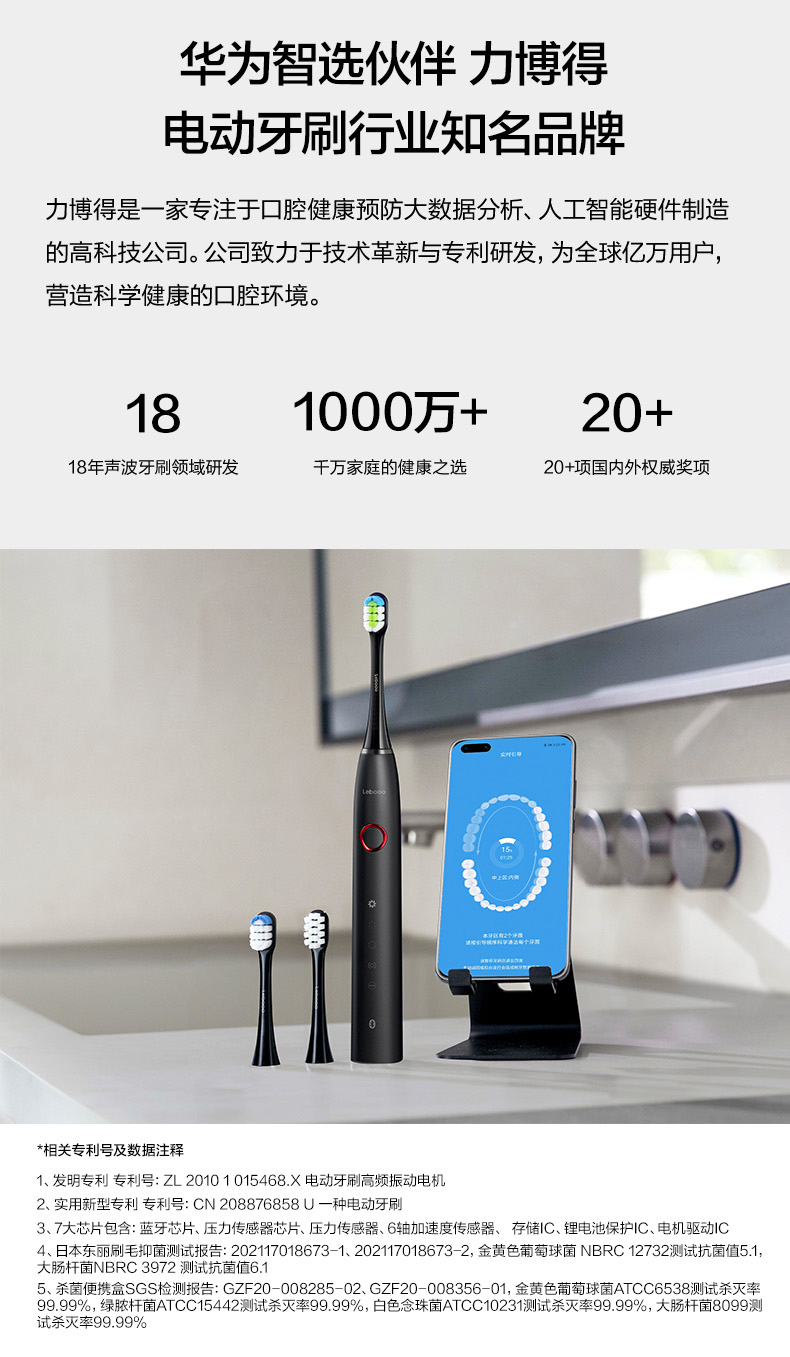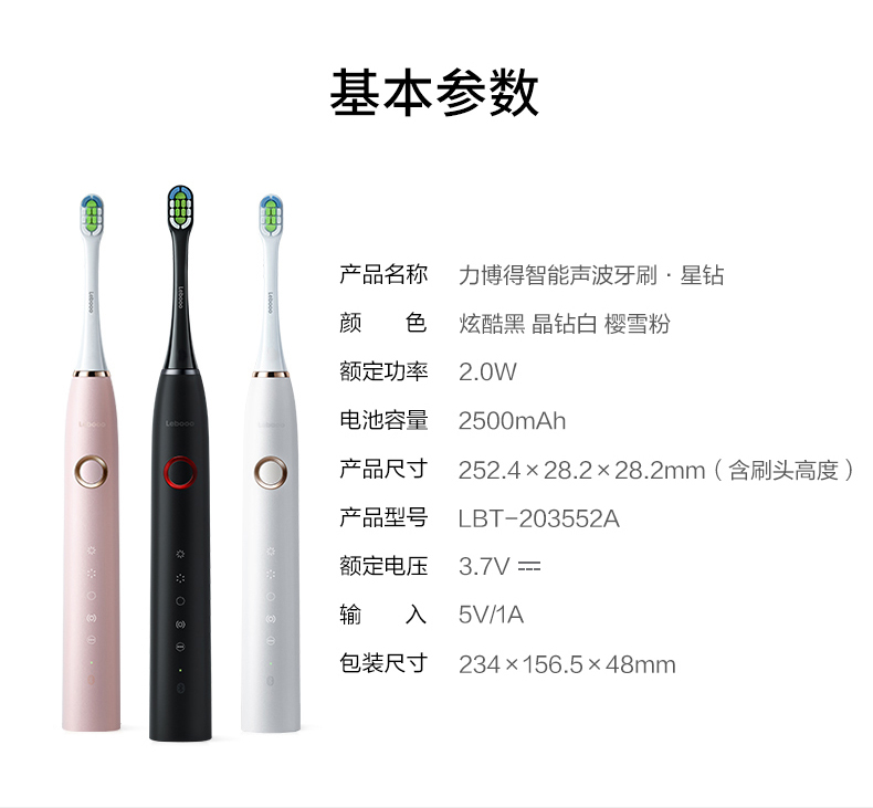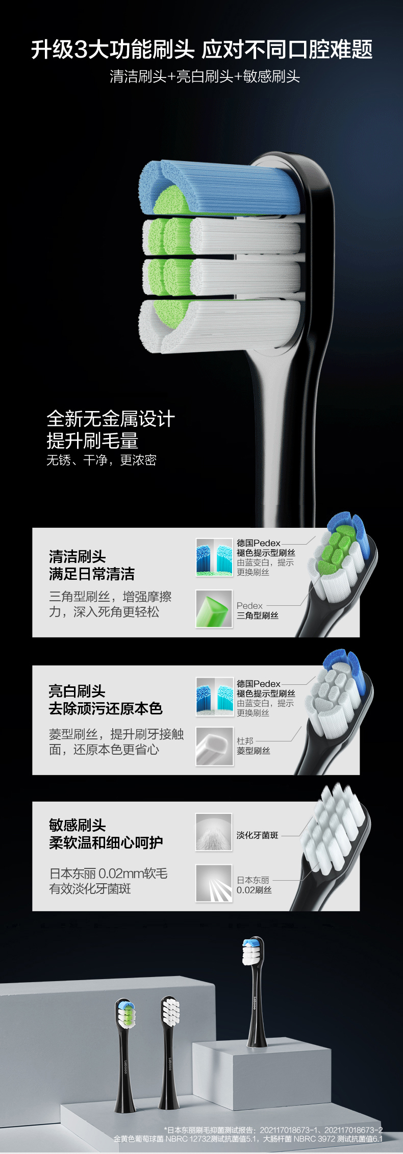 刷头方面:有清洁、亮白、敏感3只三大功能刷头,分别采用杜邦、东丽0.02mm软毛材质,复合FDA标准,并采用德国Pedex褪色丝,颜色由蓝变白提示更换刷头。