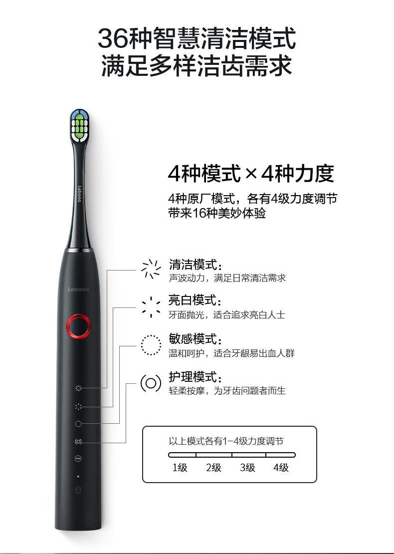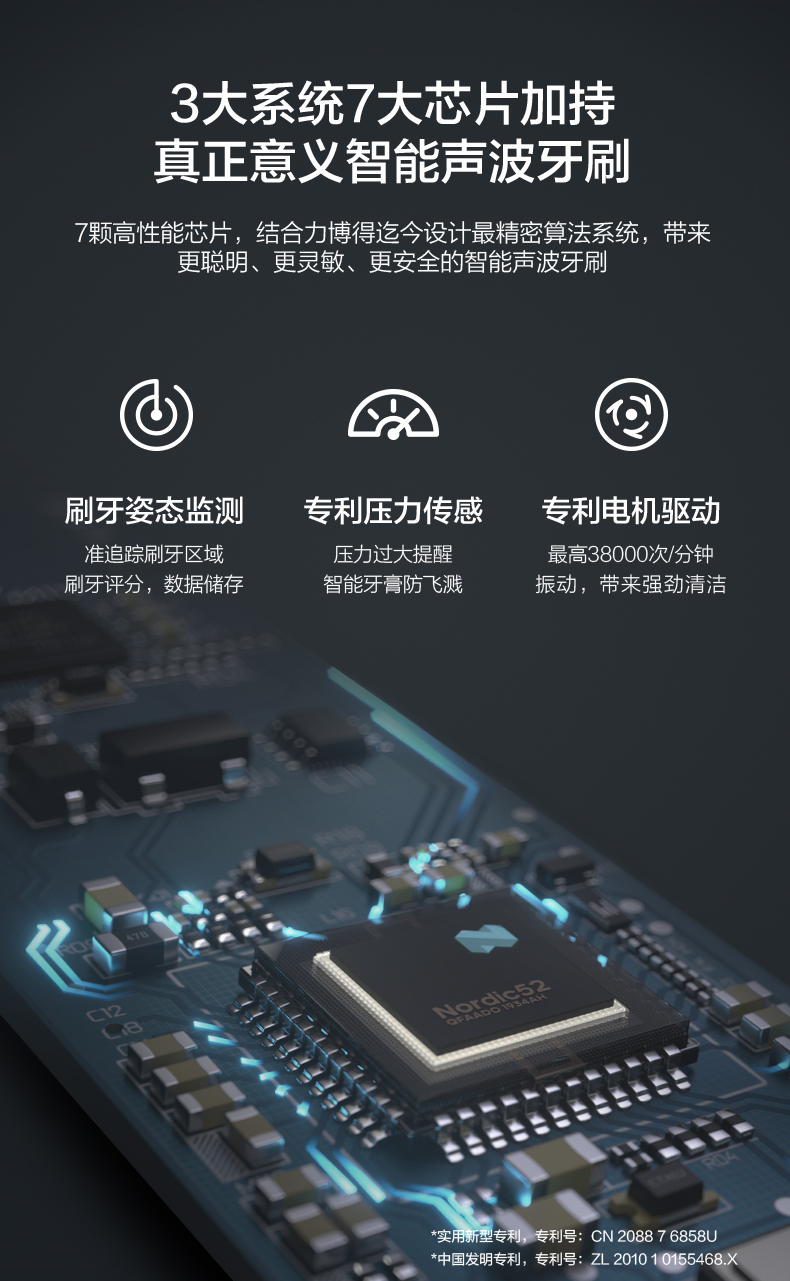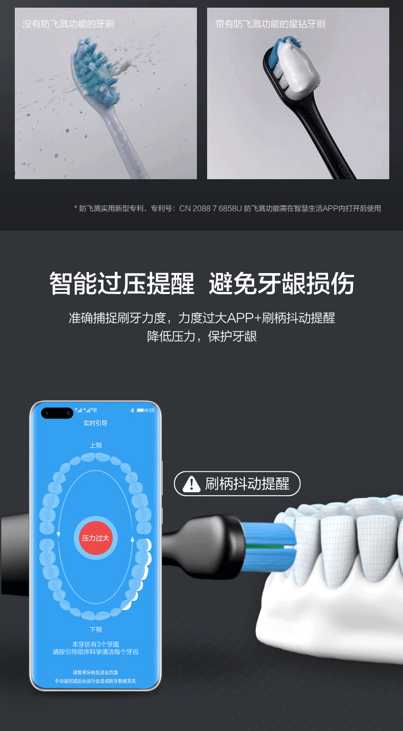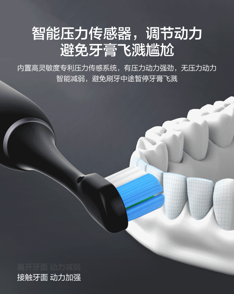 内置高灵敏度专利压力传感系统,有压力动力强劲,无压力动力智能减弱,避免刷牙中途暂停牙膏飞溅;智能过压提醒,避免牙龈损伤(力度大于APP+刷柄抖动提醒降低压力)