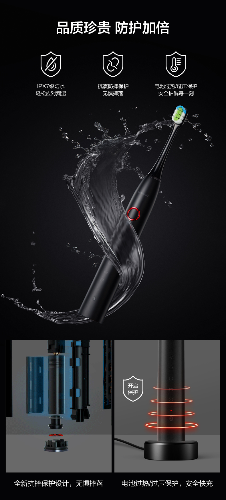 电池方面:2500毫安锂电池无线感应快充、防过热、过压;抗摔保护设计,IPX7级防水;
