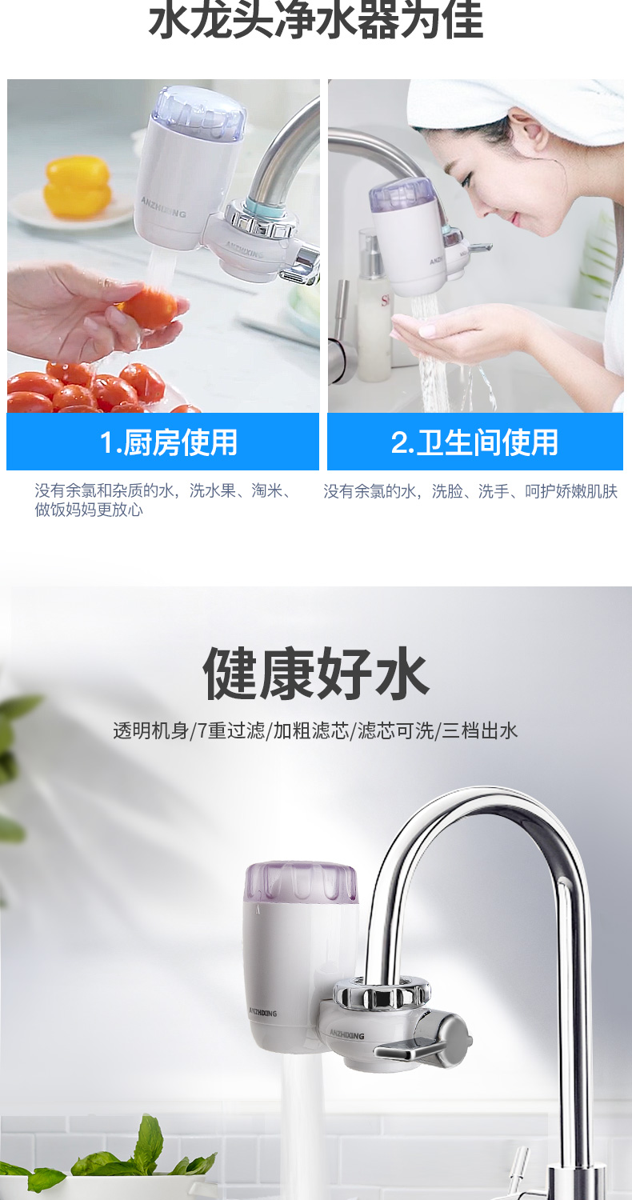 这款安之星 厨房净水龙头净水器,7层精密过滤,滤芯可清洗。有原水、净水、花洒3种出水模式,应对不同场景。采用天然硅藻泥陶瓷、亚硫酸钙、KDF抑菌金属簇、麦饭石天然矿化球、高精PP棉、椰壳活性炭、不锈钢滤网制作而成。