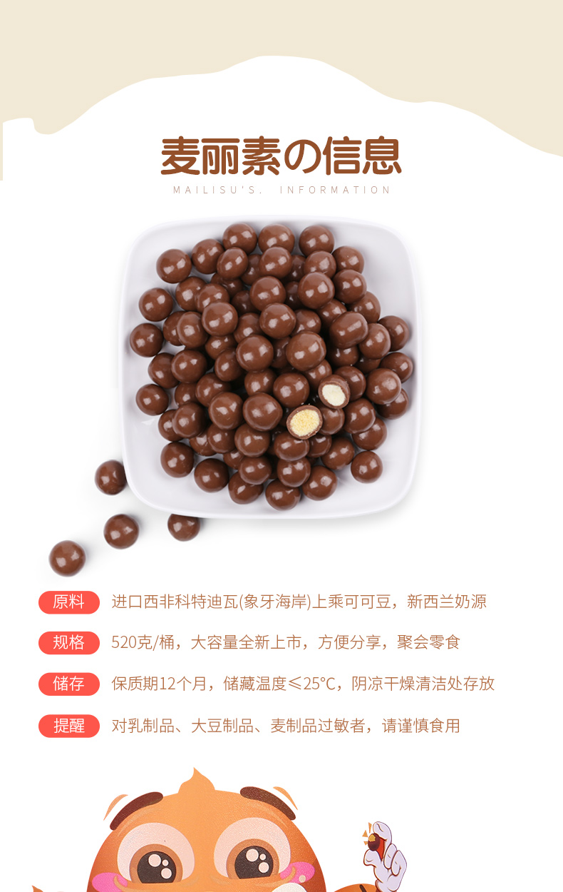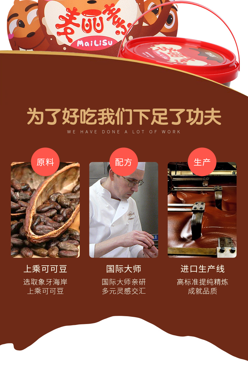 选用进口科特迪瓦(象牙海岸)上乘可可豆和新西兰进口全脂奶粉制作,遵循国际大师亲研配方,多元灵感共同交汇,入口香甜酥脆,多种口感,规格为520g,大桶实惠装。