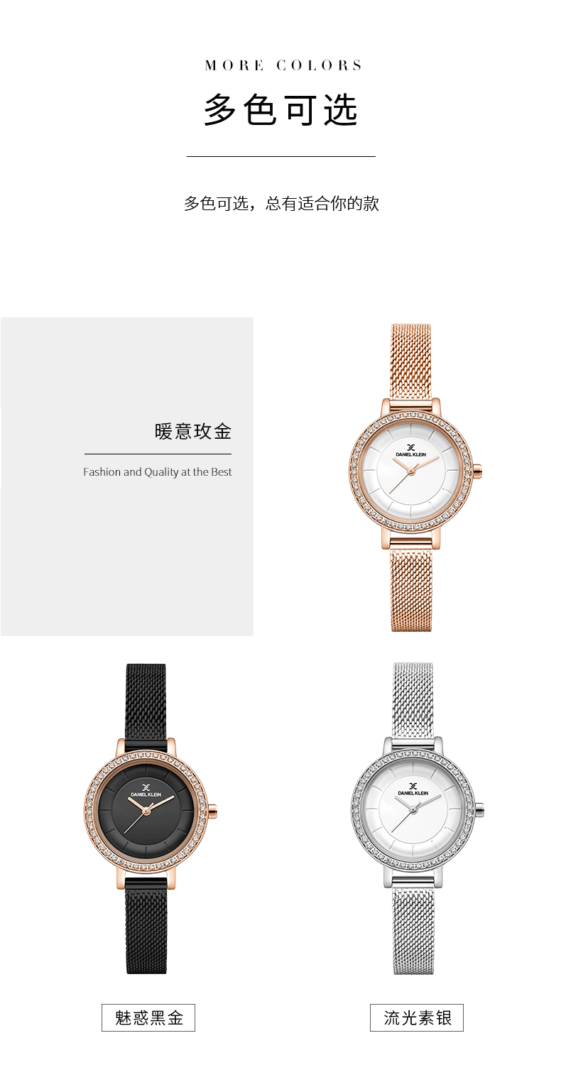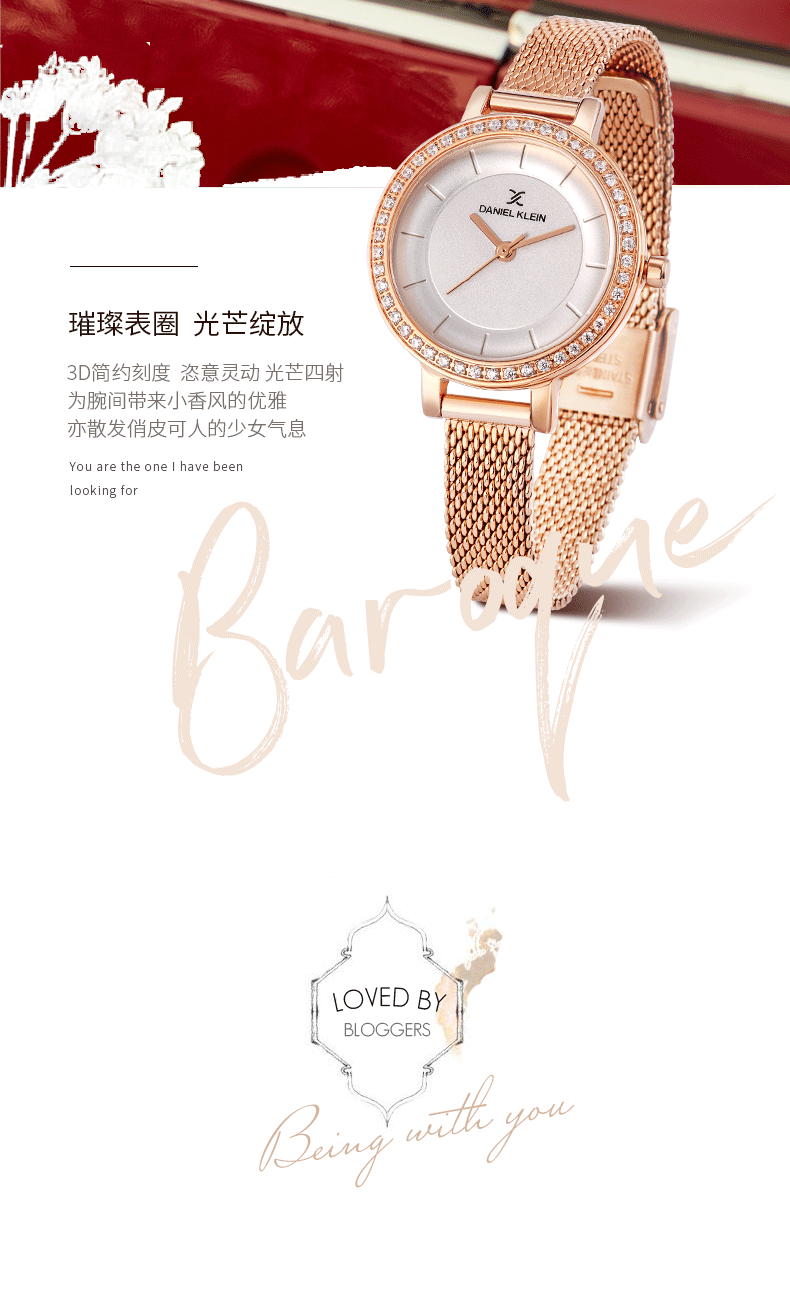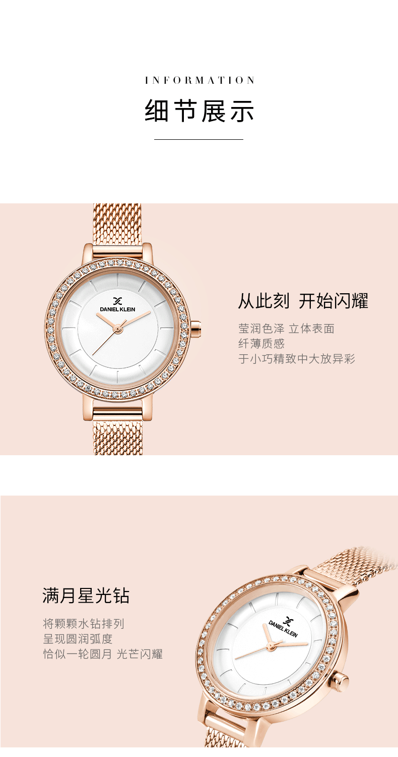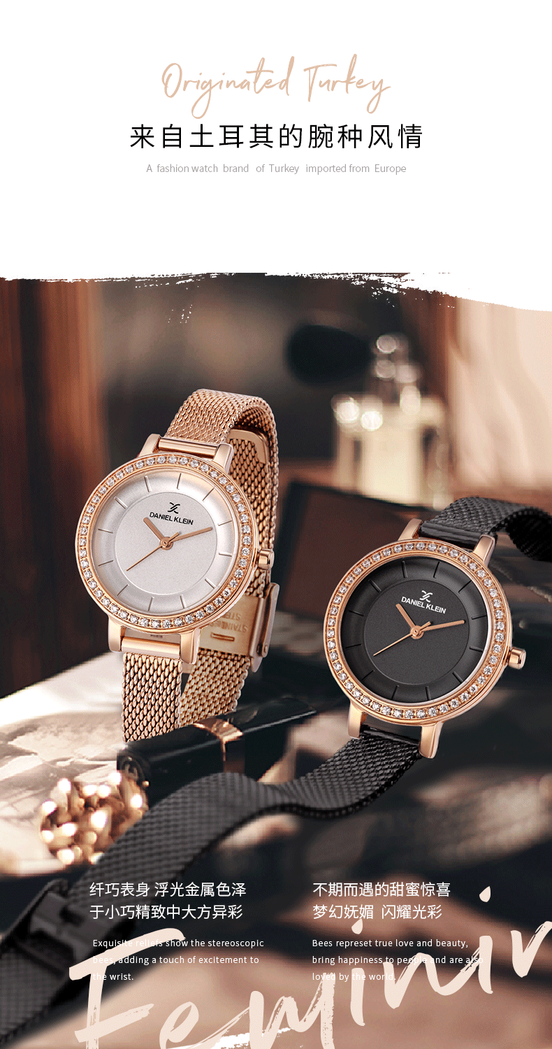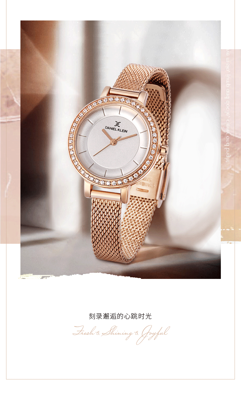 这款Daniel Klein 女士花漾腕表,灵感源自山茶花,立体花瓣表盘设计,在阳光下,蓬松的花瓣,绽放层层星光。洁白的表盘搭配晶钻闪耀星芒。3D简约刻度,恣意灵动,亦散发俏皮可人的少女气息。立体表面,表镜采用矿物质强化玻璃镜面,米兰尼撕钢带,细腻柔滑,呈现腕间美学。石英机芯,表盘直径30mm,30M生活防水。