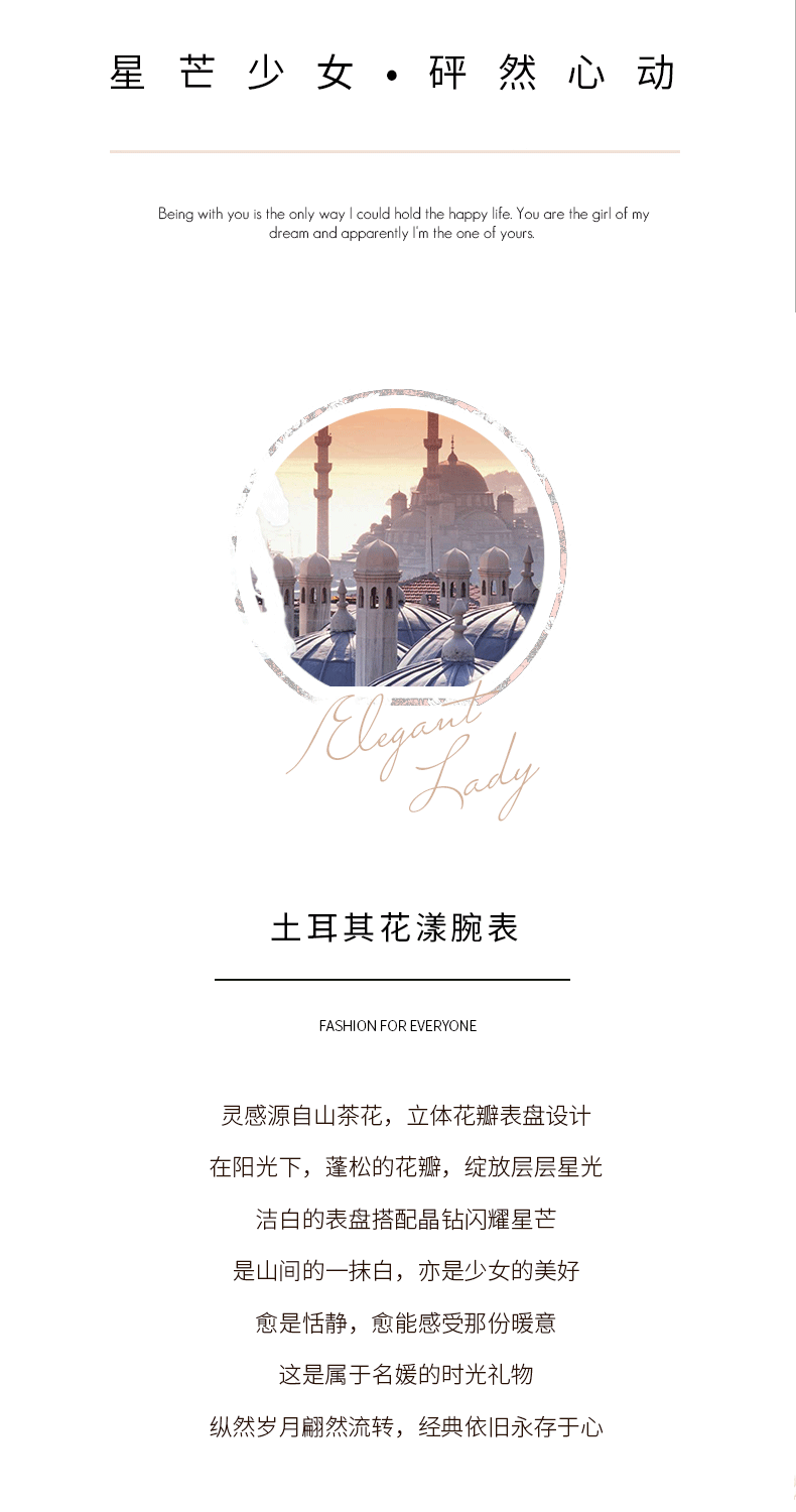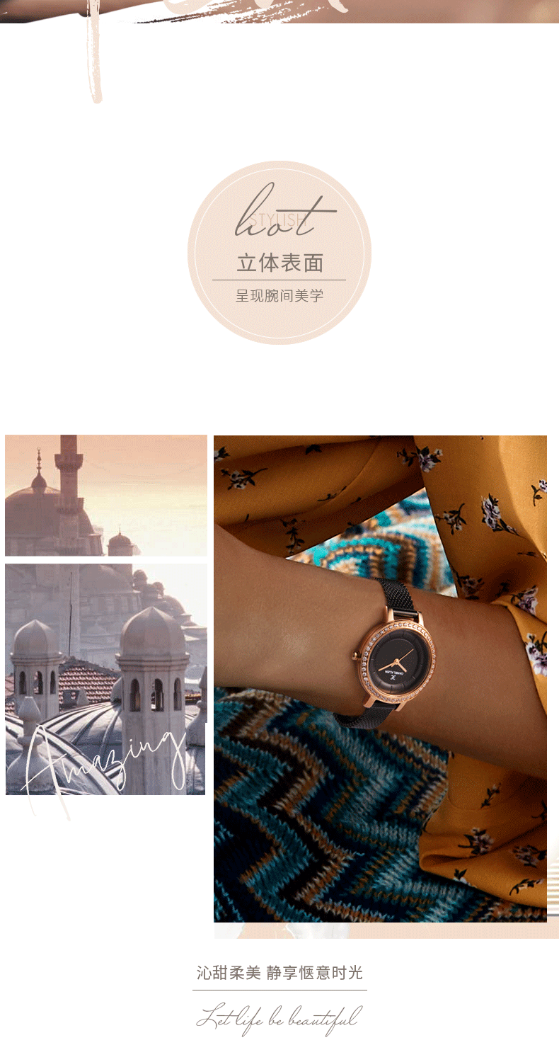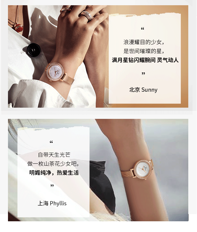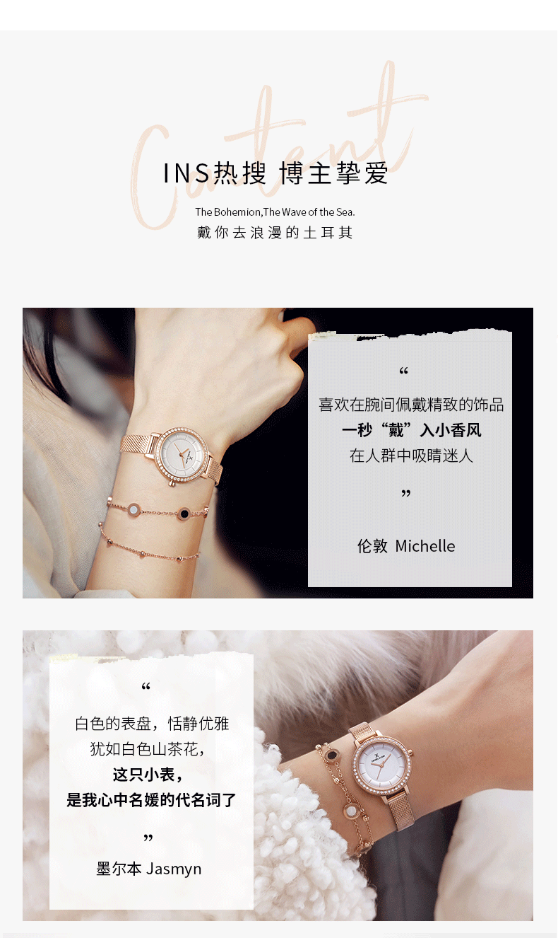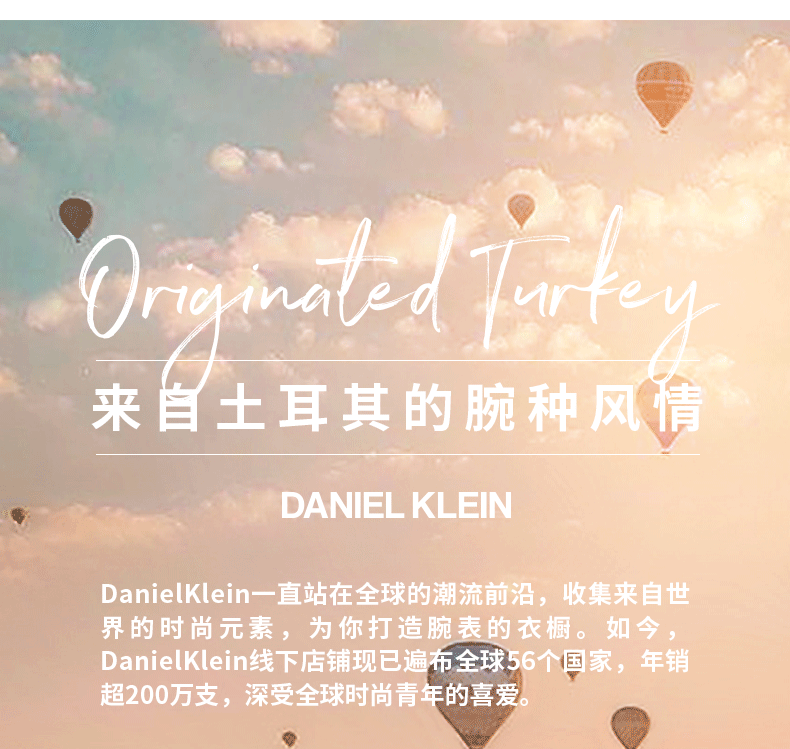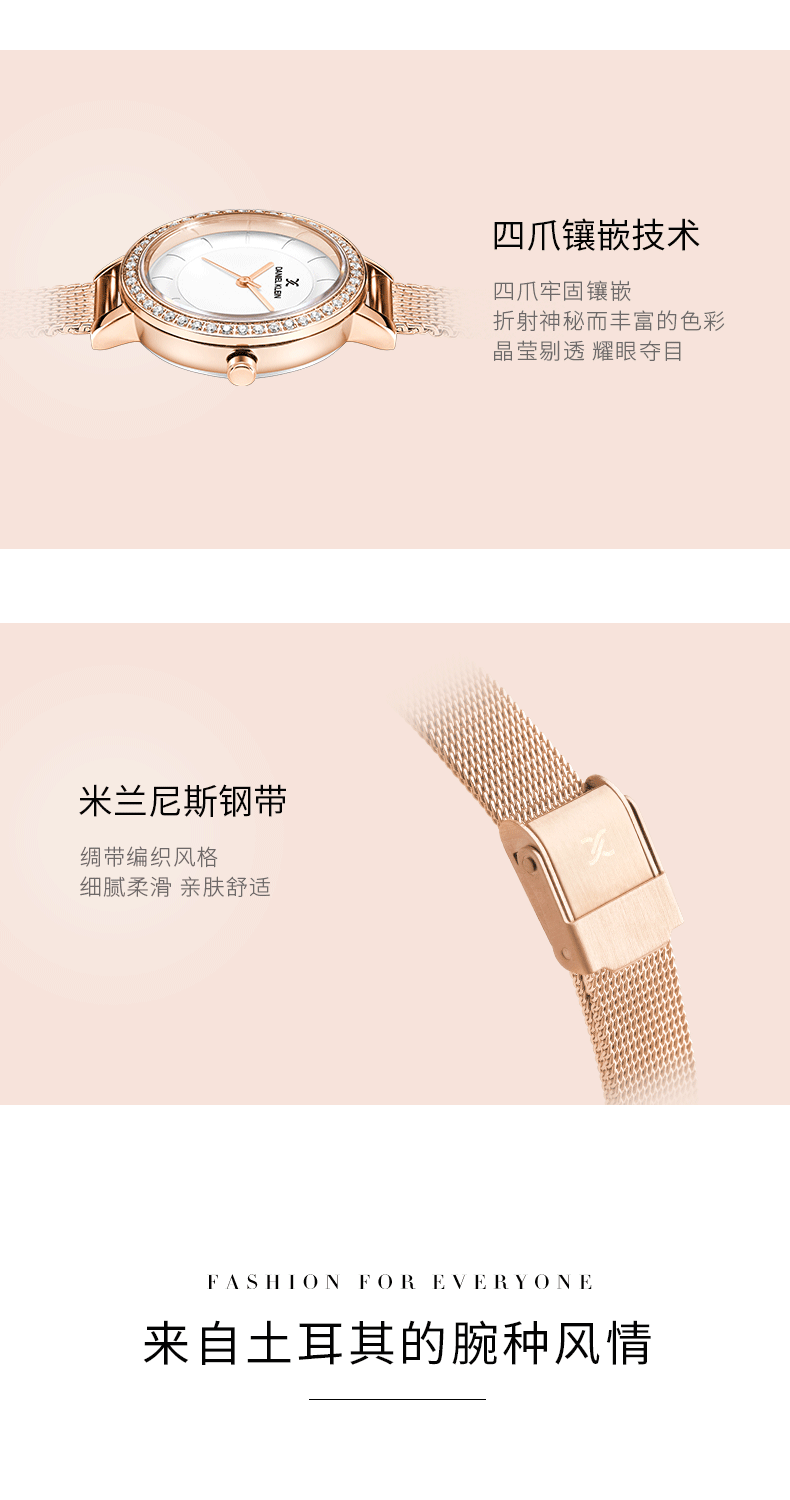 这款Daniel Klein 女士花漾腕表,灵感源自山茶花,立体花瓣表盘设计,在阳光下,蓬松的花瓣,绽放层层星光。洁白的表盘搭配晶钻闪耀星芒。3D简约刻度,恣意灵动,亦散发俏皮可人的少女气息。立体表面,表镜采用矿物质强化玻璃镜面,米兰尼撕钢带,细腻柔滑,呈现腕间美学。石英机芯,表盘直径30mm,30M生活防水。