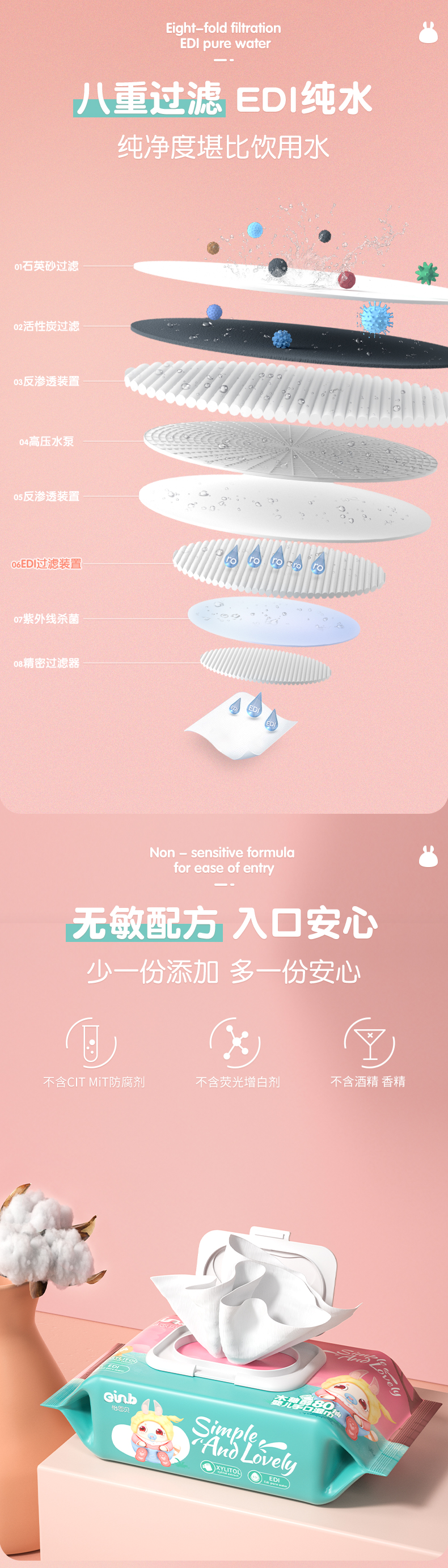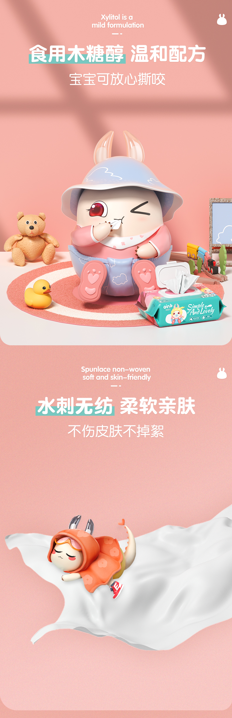 袋装带盖婴儿级湿巾,采用超纯水、水刺无纺布制作。含有维生素E和木糖醇等有益皮肤的元素,手润触感。