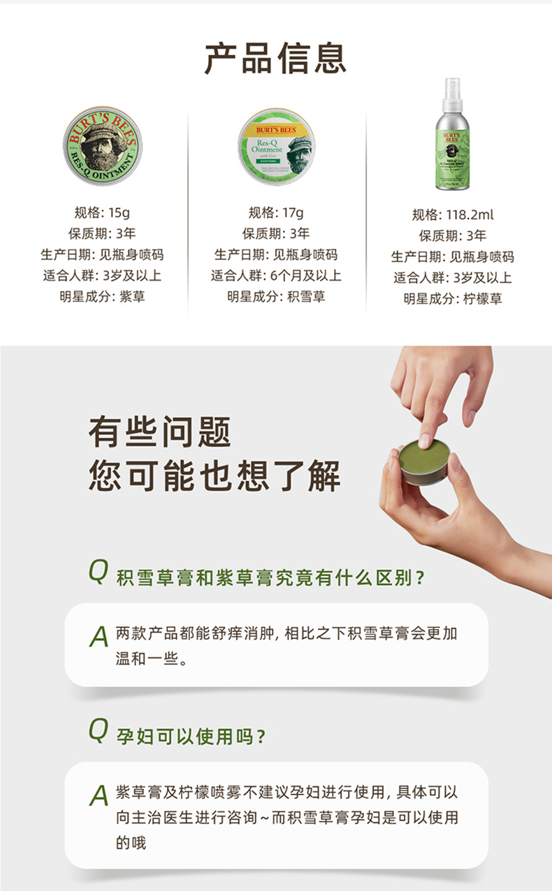 这款伯特小蜜蜂 紫草膏,在天猫止痒类目中累计销售额NO.1,美国进口,萃取天然植物精粹-紫草叶提取物、小麦胚芽油、薰衣草花油,无激素和其他添加,具有舒痒消包、舒缓肿痛、舒心提神的的功效,味道也很好闻。