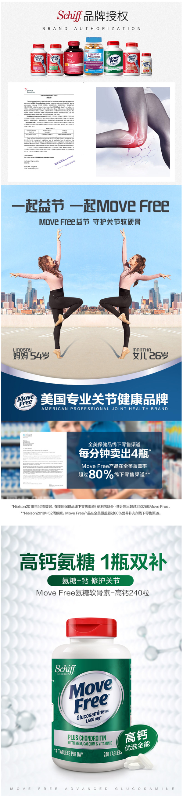 Move Free维骨力,是美国关节保健品市场上的第二大品牌,母品牌Schiff有近80年历史。Move Free最大的特点,是针对骨关节保健盲区“软骨”进行营养补充,核心营养素是“氨基葡萄糖”,也叫氨糖,美国有专门的医疗机构论证过氨糖的有效性。