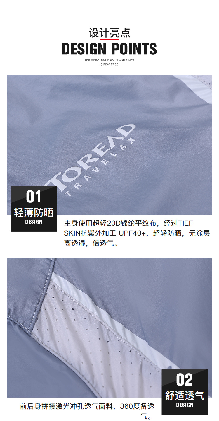 使用TlEF SKIN防晒科技,模仿日落蝶鳞翅结构和蝶粉防晒原理,在原料及纺丝过程中加入纳米级防晒因子,牢牢包裹住织物纤维形成了天然的防晒盾牌,阻隔紫外线入侵,拥有UFP 40+的防晒能力。
