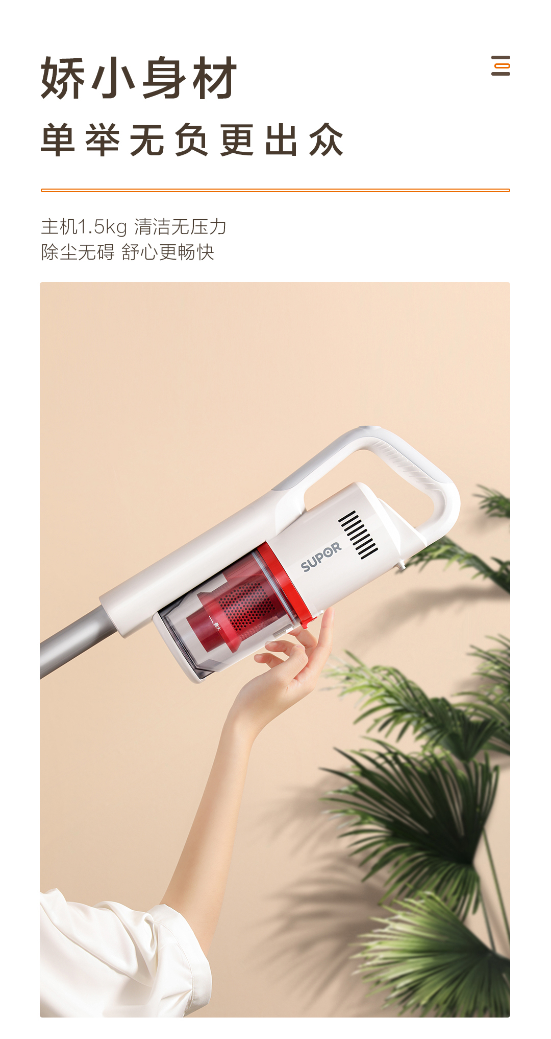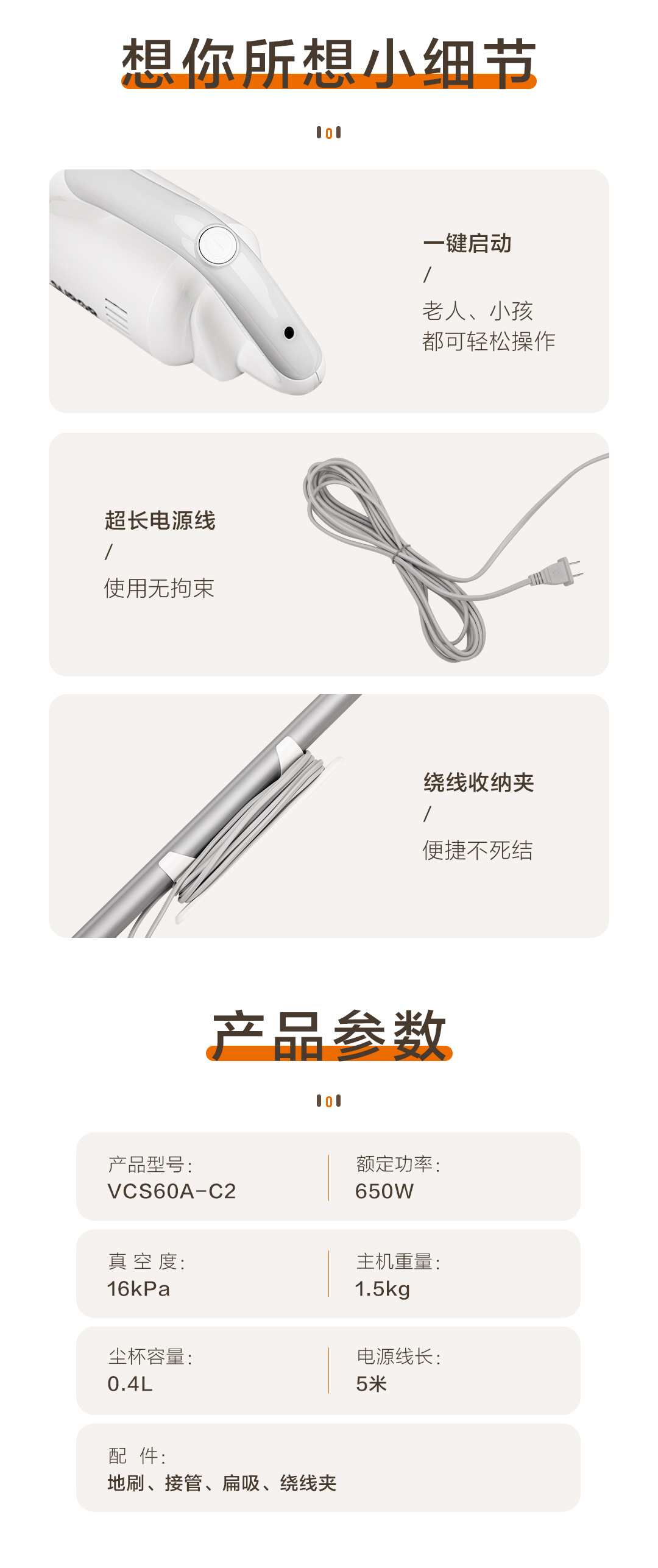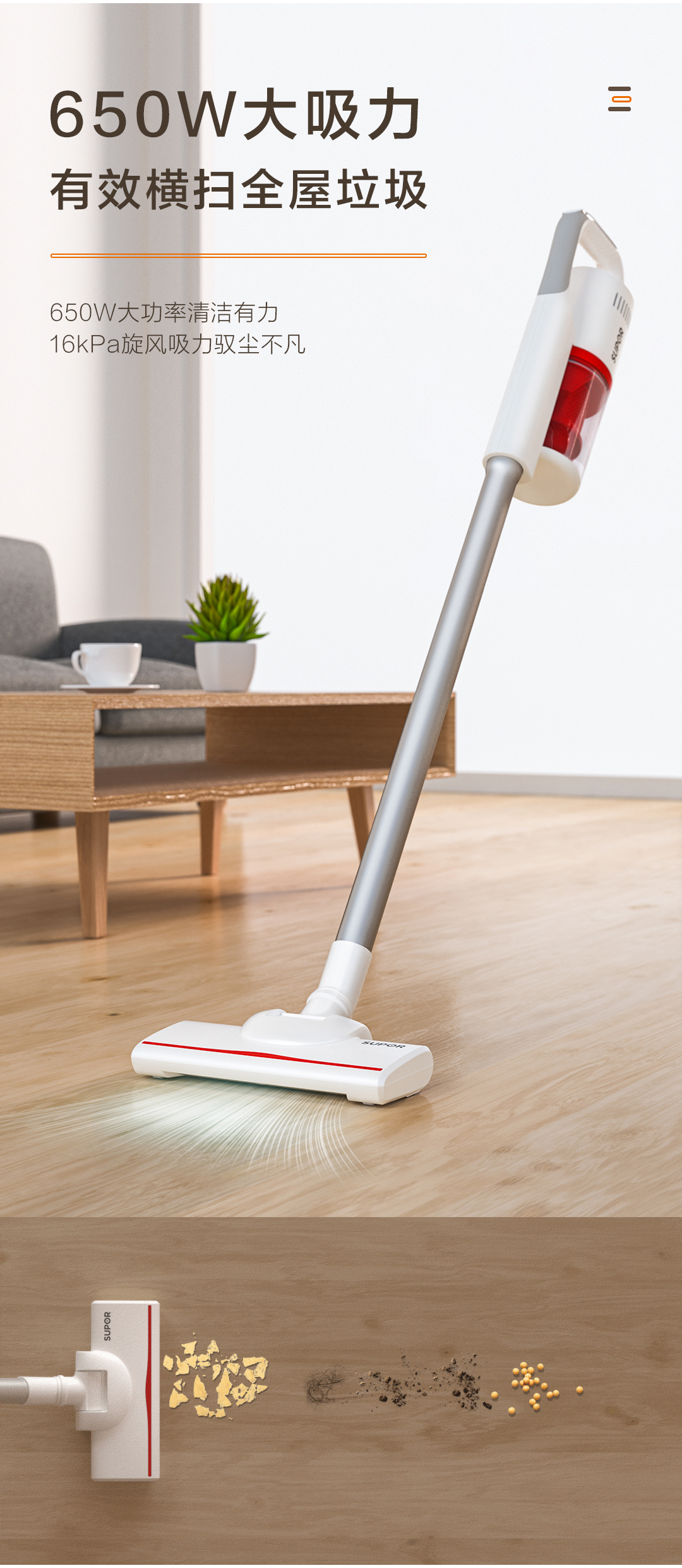 这款苏泊尔VCS60A-C2手持式小型吸尘器,推杆/手持2合1,适用于各个环境。功率是650W,拥有16kPa吸力,主机仅重1.5kg,使用过程中不累手。
