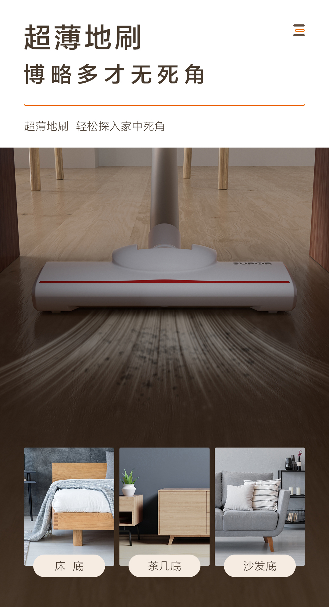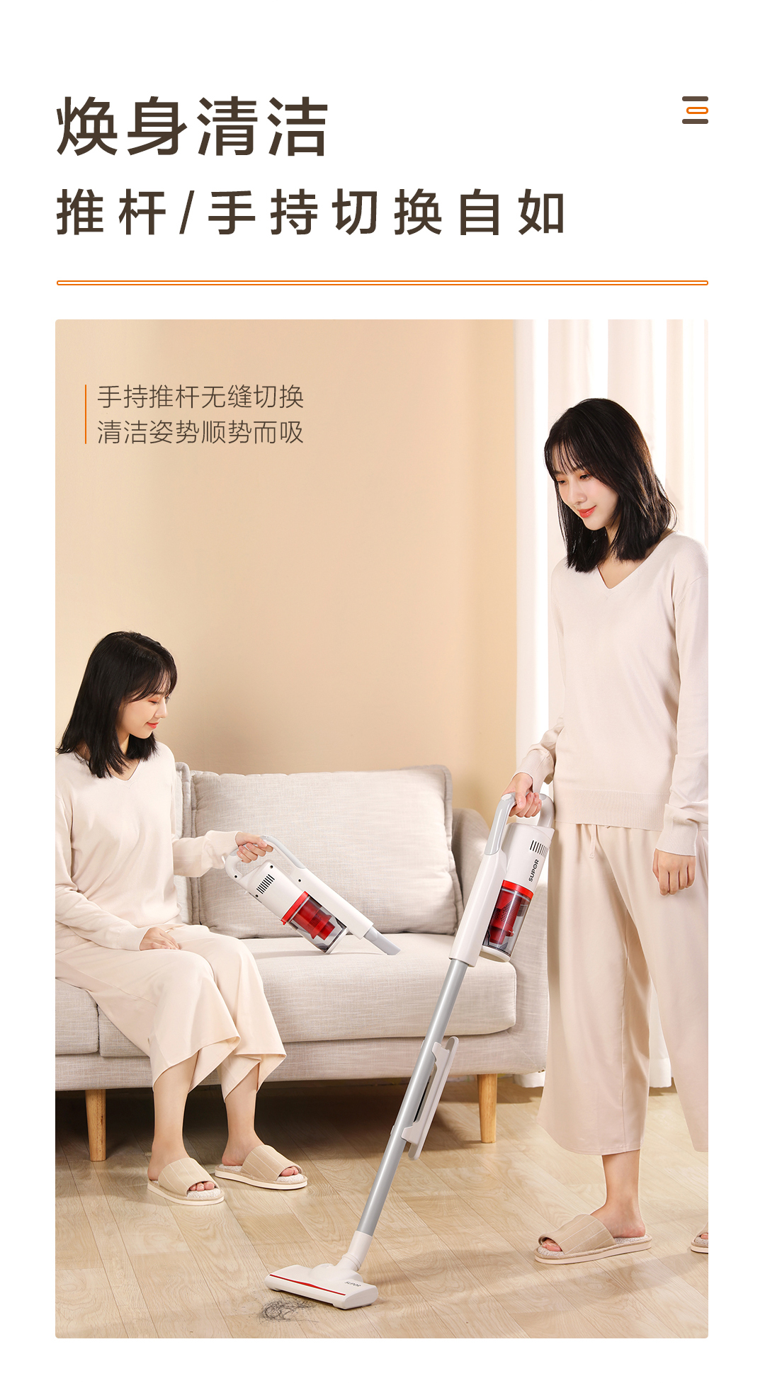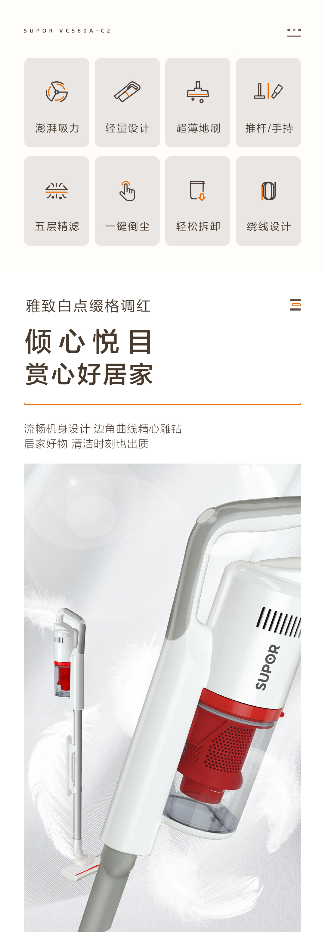 这款苏泊尔VCS60A-C2手持式小型吸尘器,推杆/手持2合1,适用于各个环境。功率是650W,拥有16kPa吸力,主机仅重1.5kg,使用过程中不累手。
