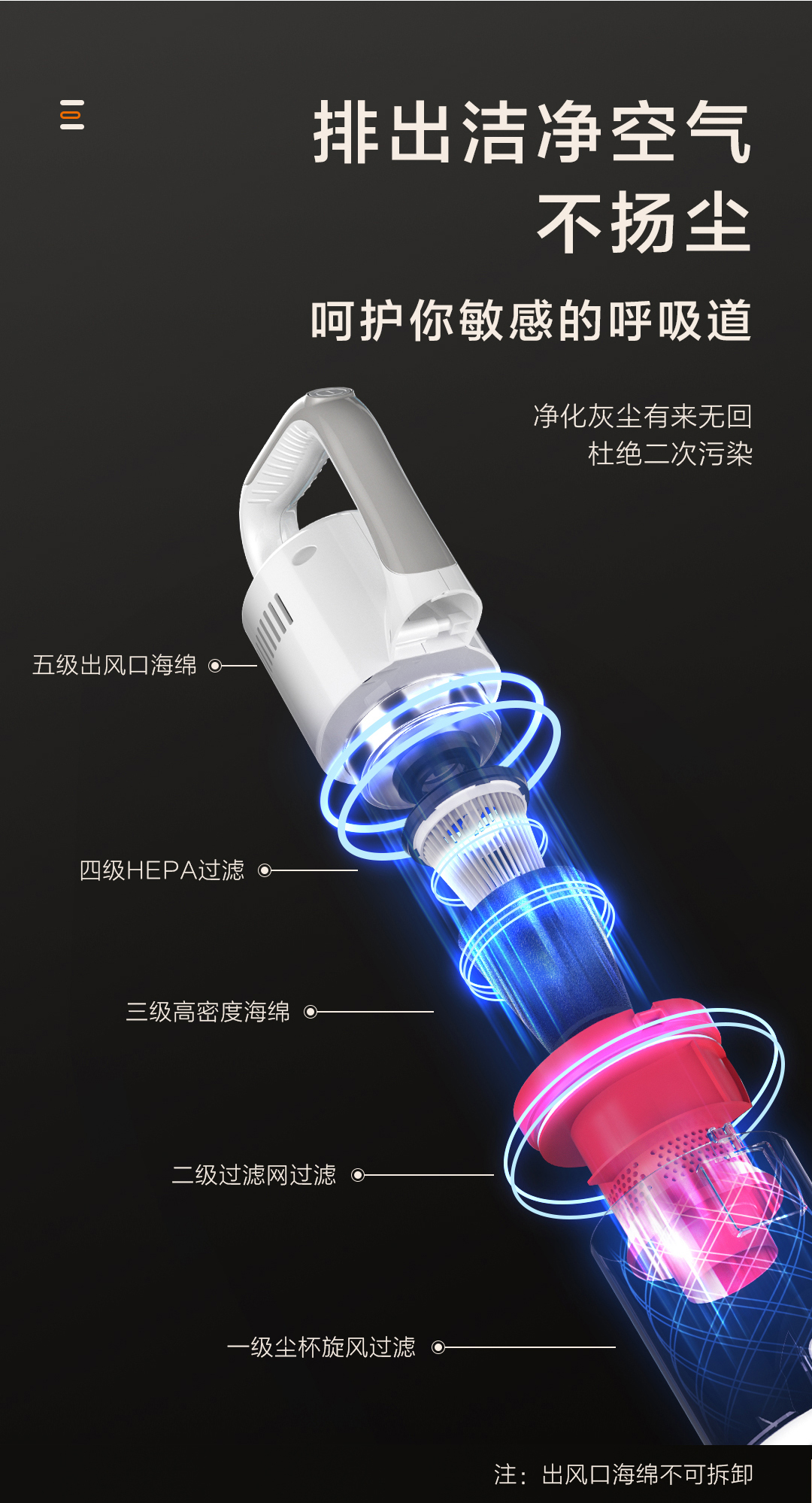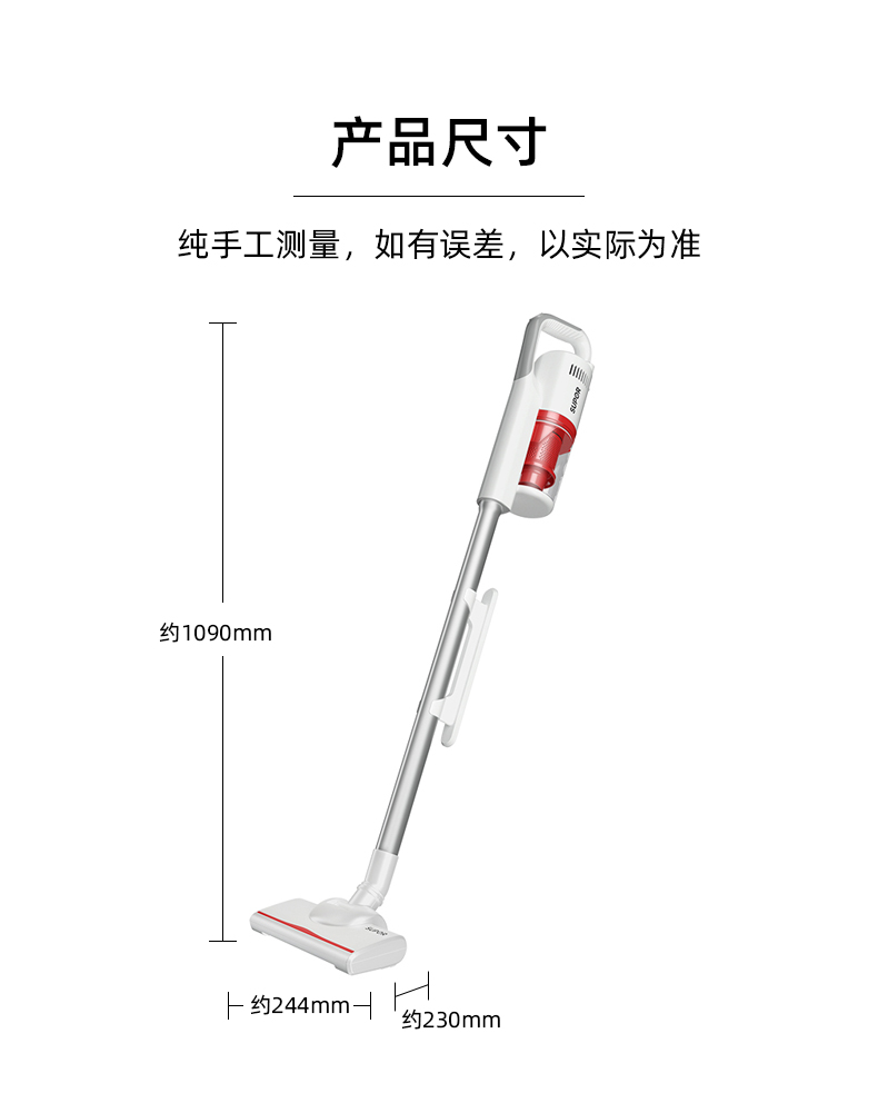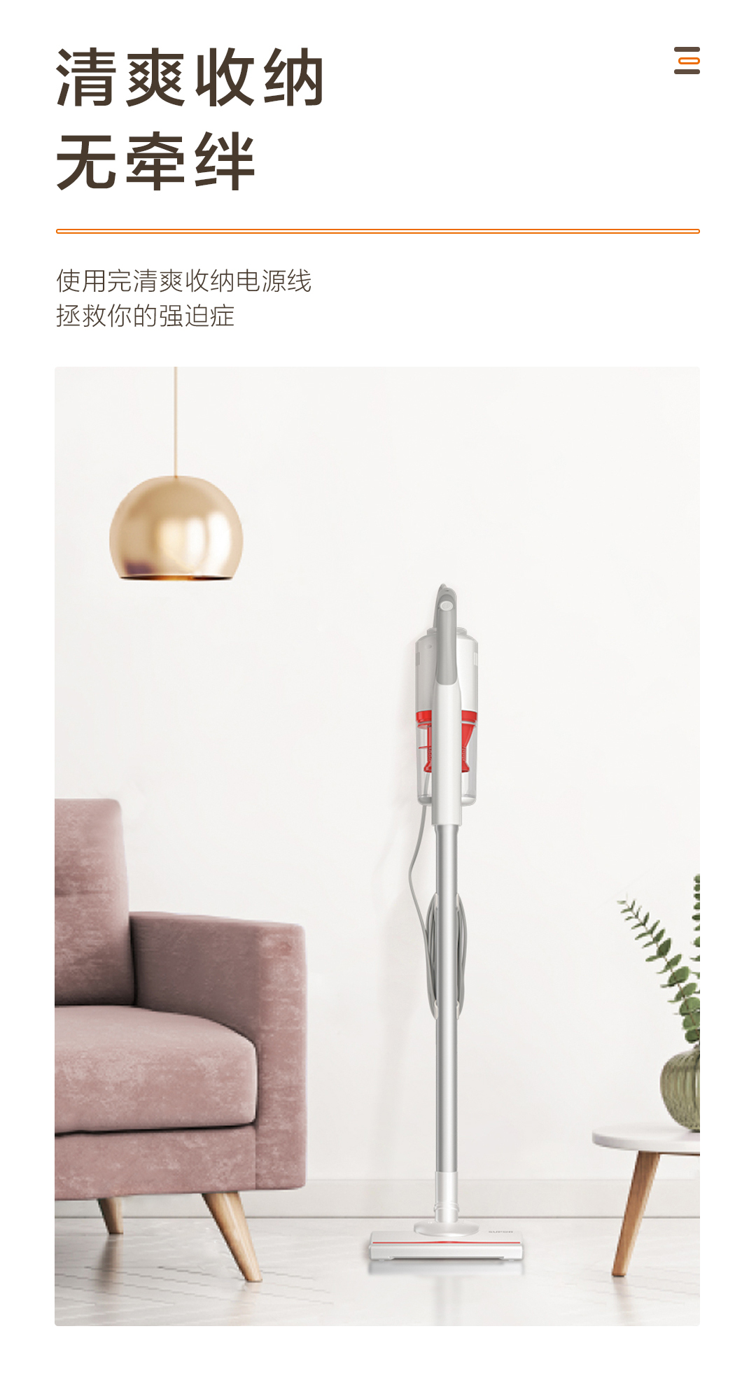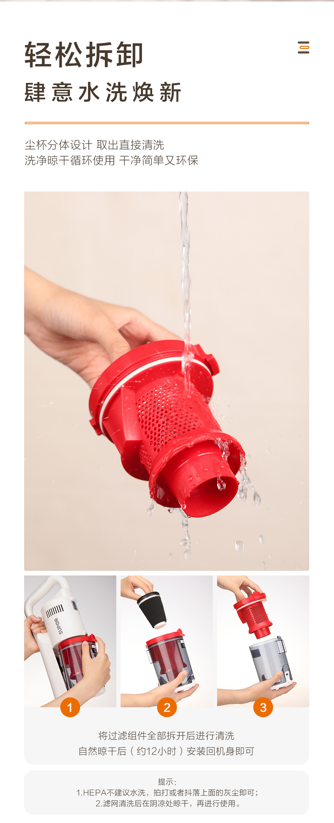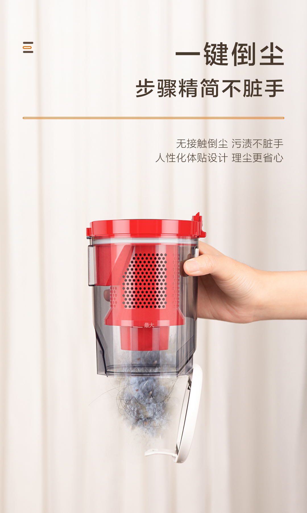 一键倒尘,无需接触灰尘污渍,不脏手。尘被分体设计,可以取出直接清洗晾干循环使用。电源线长5m,机身可以收纳电源线,尘杯容量0.4L。