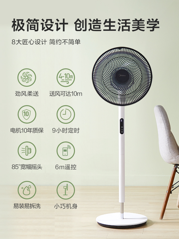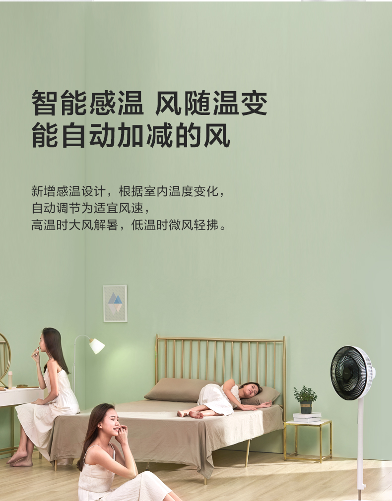 美的 智能温感风扇,9档风速,新增智能感温设计,可根据室内温度变化,自动调节为适宜风速,高温时大风解暑,低温时微风轻拂,送风距离最高可达10m。