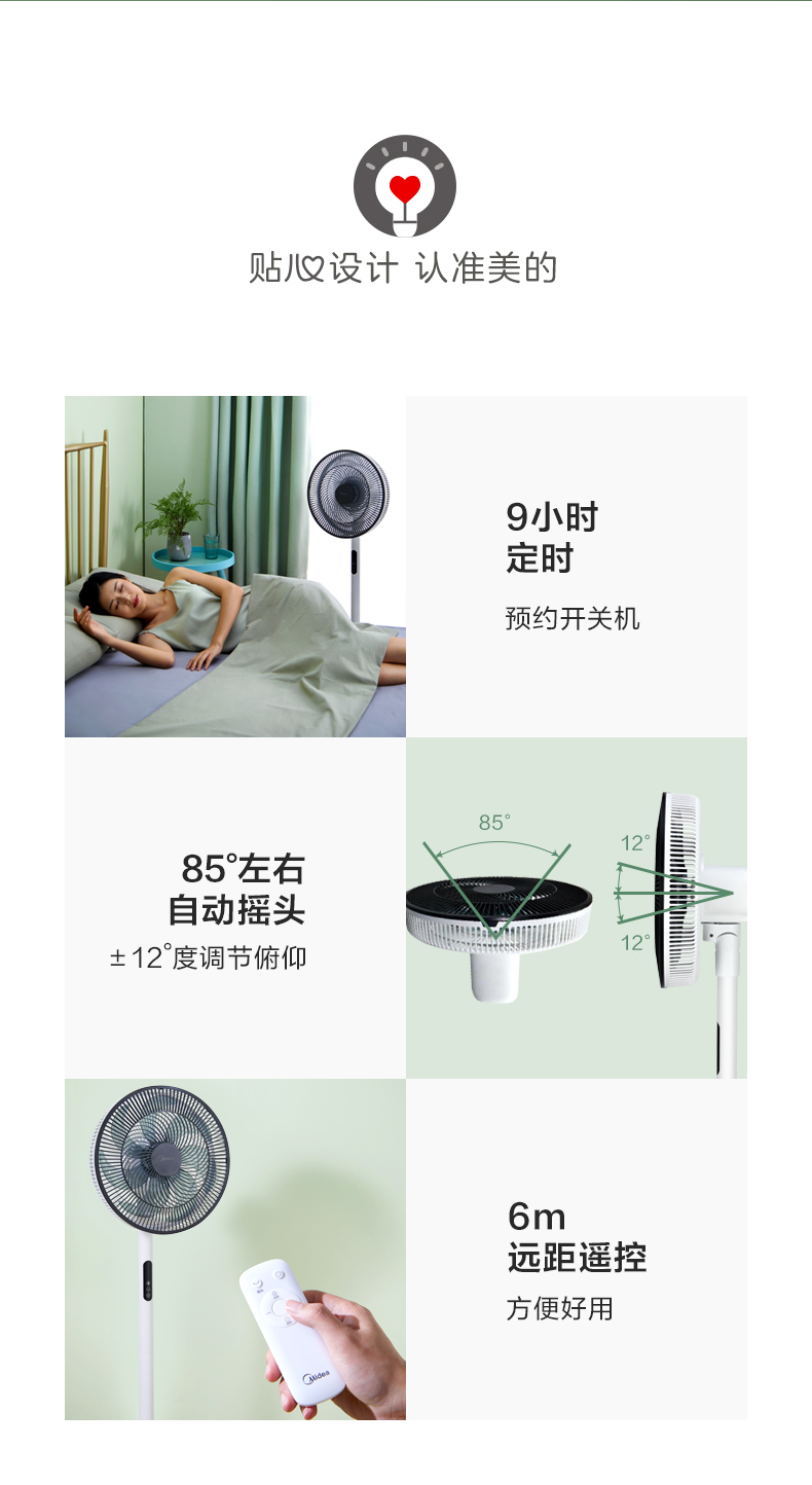 有6档正常风+3档睡眠风共9档可调,可满足不同所需,左右自动85度摇头送风,上下±12°调节仰俯,可9小时预订开关机,6m遥控,操作简单方便。