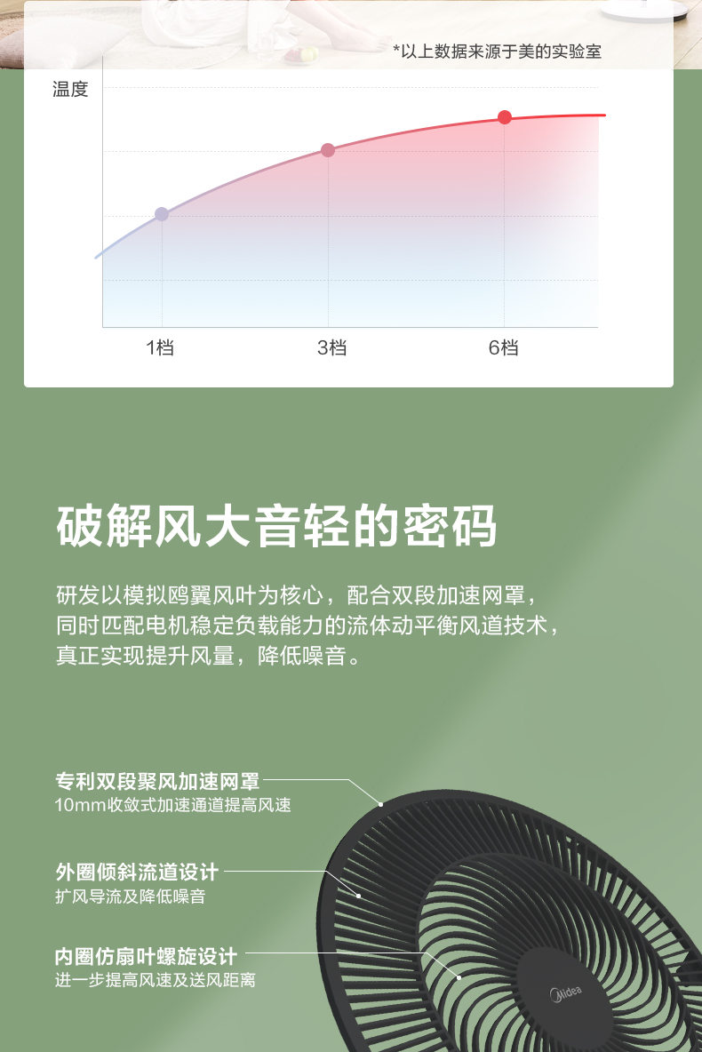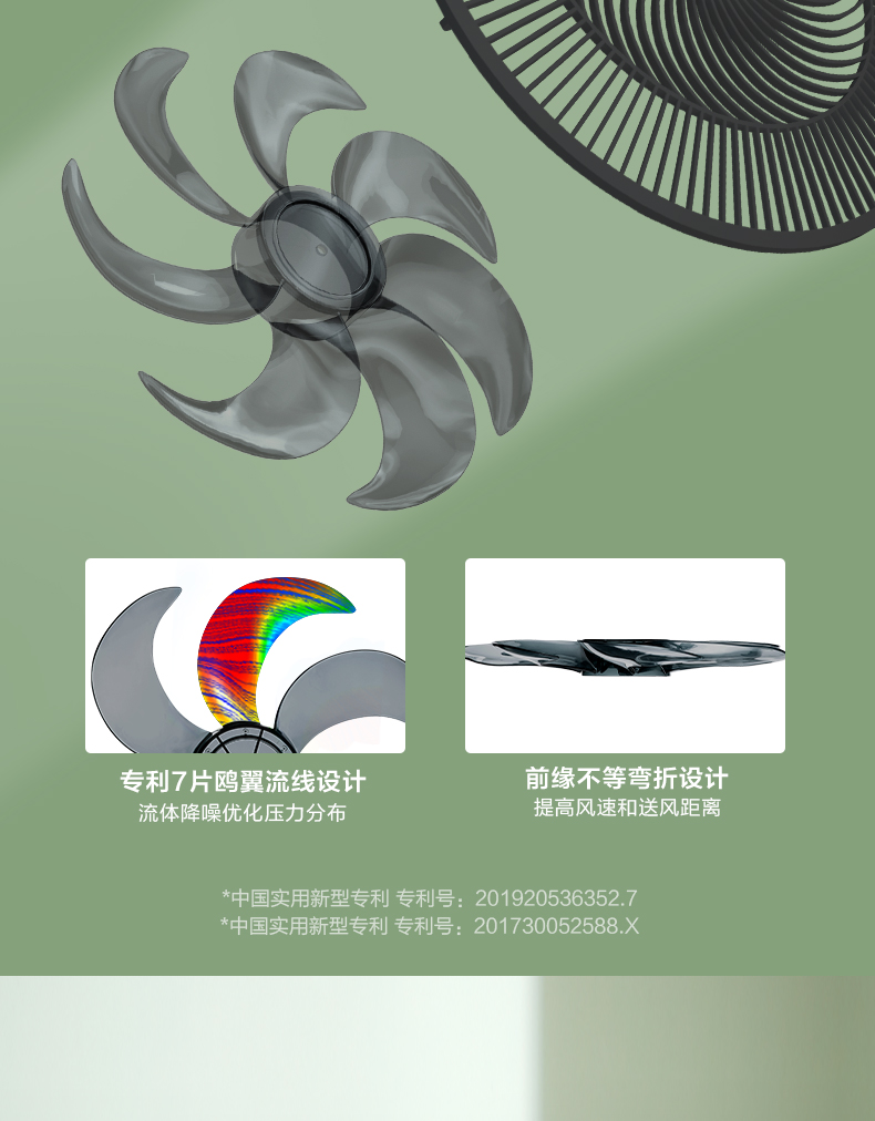细节上:专利7叶鸥翼风叶,配合双段加速网罩,同时匹配电机稳定负载能力的流体动平衡风道技术,切风细腻柔和,有效减弱空气对面部冲击,同时实现提升风量,降低噪音,体感更加舒适;
