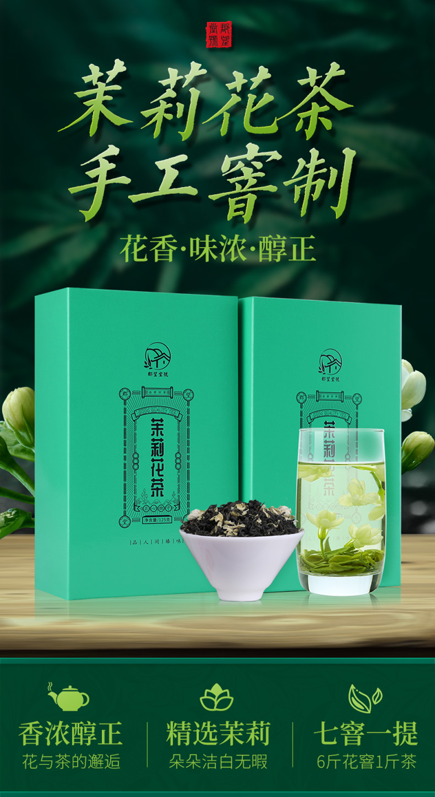 这款郡望堂号正宗茉莉花茶,特级浓香型,选用横县原产浓香茉莉和高山绿茶,茶形花形匀整优美、白毫密布。冲泡后,鲜浓的茉莉花香飘逸,花香茶香相互渗透,沁人沁脾,这是花与茶的完美邂逅,口感醇正顺滑。