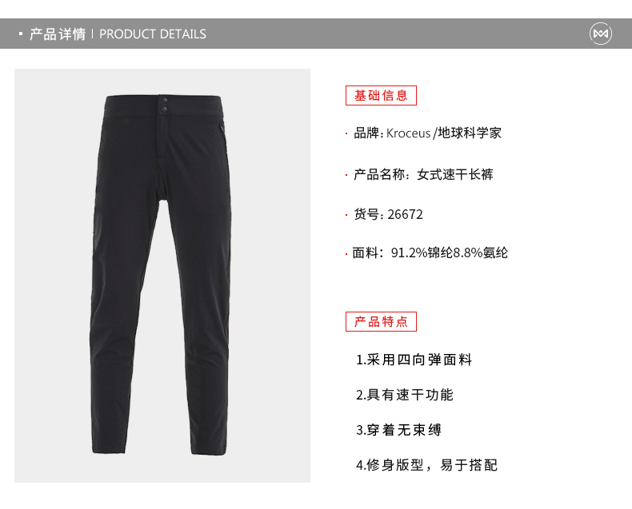这款地球科学家女速干裤,使用91.2%的靠谱抗撕裂速干尼龙面料,耐磨抗撕裂不易破损。尼龙纱线呈多股中空状,中空管道快速吸水快速向四周分散,加大挥发面积达到快干,通常在雨天淋湿后不到1小时就能干。