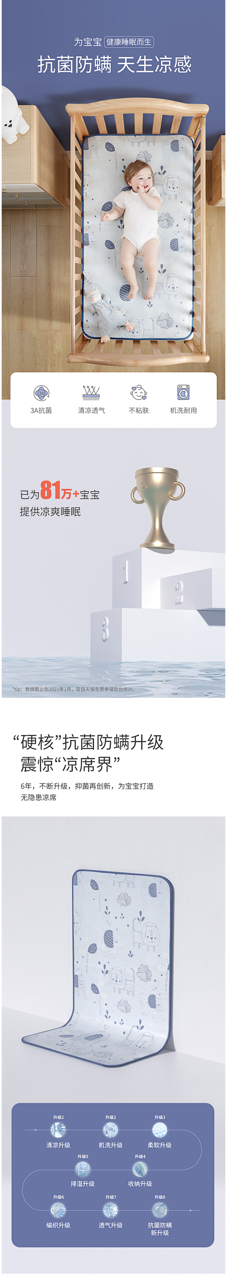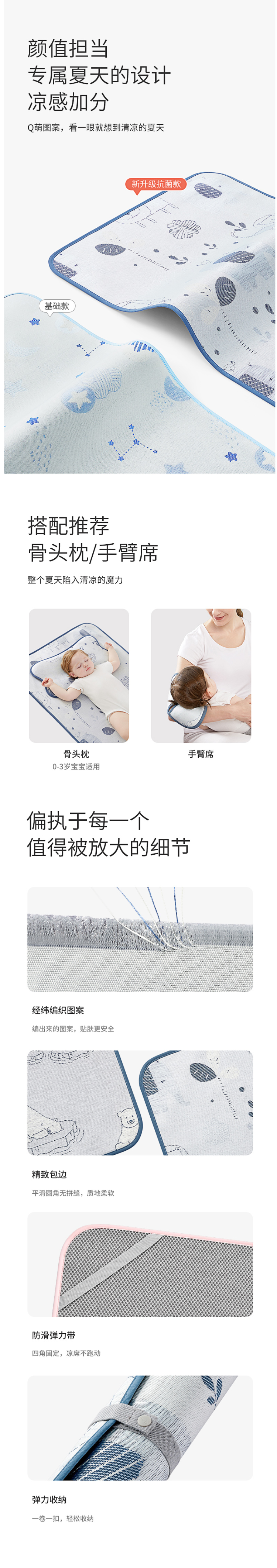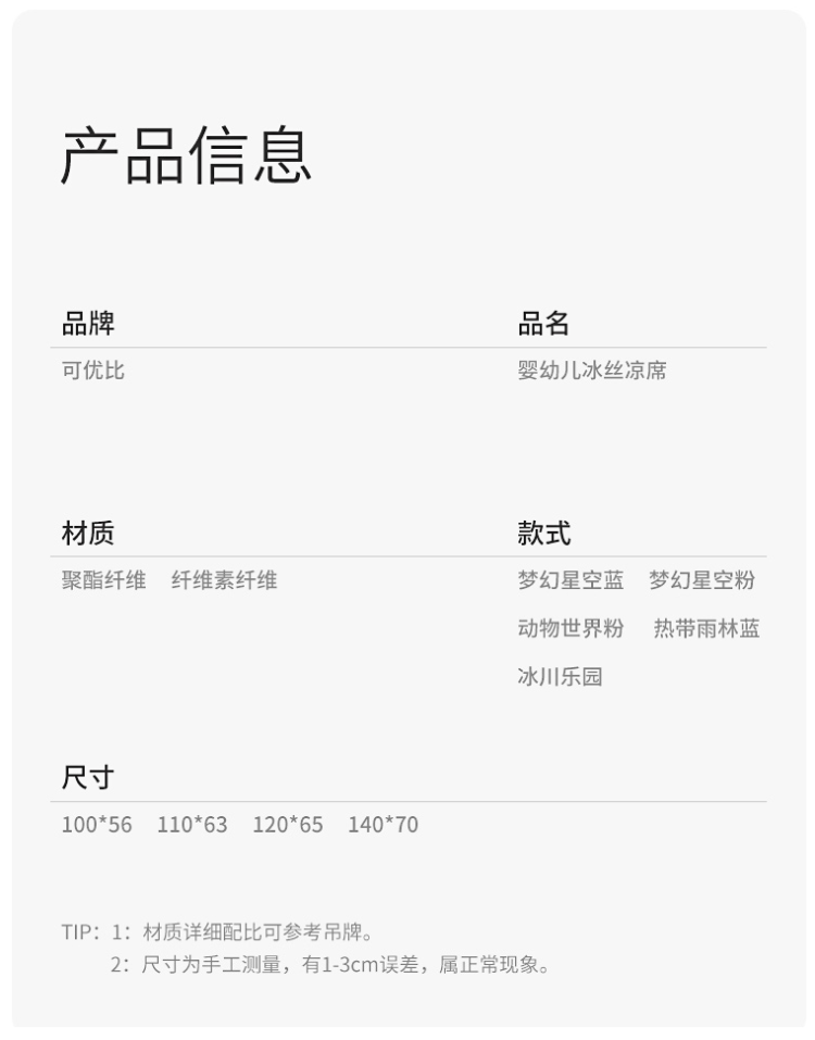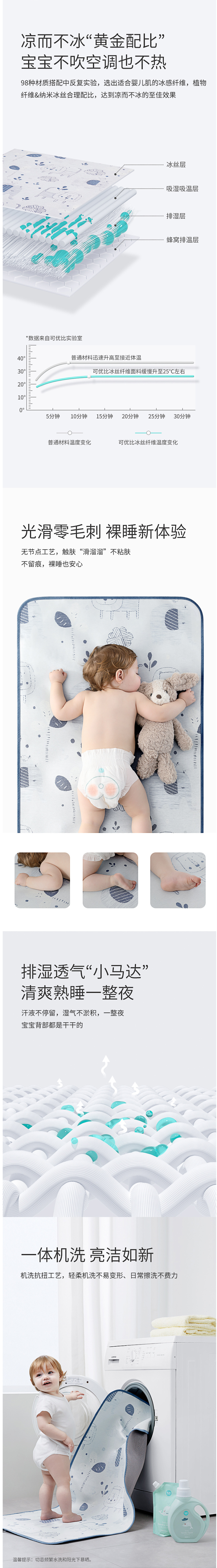 这款可优比 KUB 婴儿冰丝凉席,采用凉感冰丝+木浆纤维的经纬编织而成的凉感纤维,最适合婴儿的肌肤,凉而不冰,光滑无毛刺;双面设计,正面(A面)是智能控温冰丝层,反面(B面)是3D摩斯面料(立体透气网),智能恒温,透气散热。