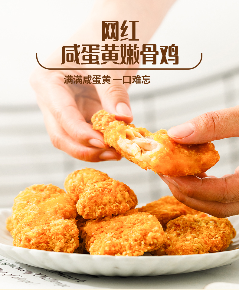 薇娅推荐,网红咸蛋黄嫩骨鸡,满满咸蛋黄,一口难忘,酥脆可口,鸡肉不干不柴,软嫩流汁,真实咸鸭蛋剥的蛋黄,咸鲜可口。