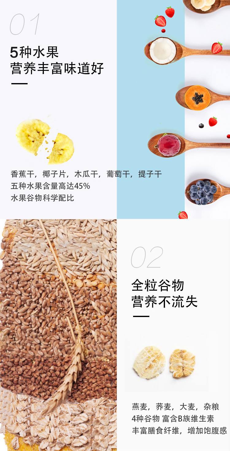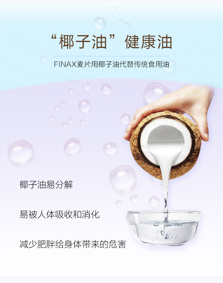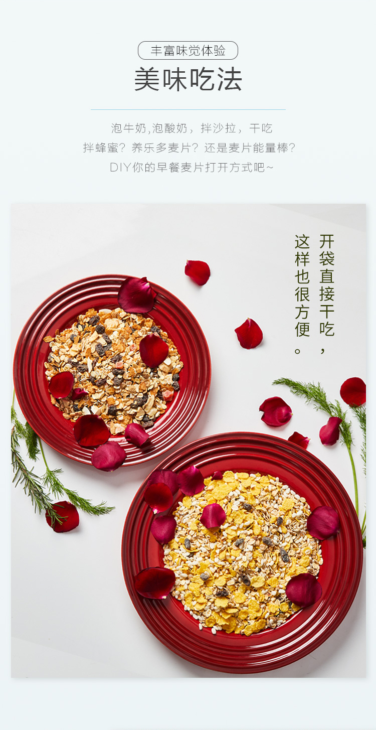 非油炸非膨化,低温烘焙,整粒谷物营养不流失。选用更易被人体吸收消化的椰子油代替传统食用油,不额外添加人工糖调味,食用更健康,富含膳食纤维,易饱腹不易发胖,可以干吃即食,或用酸奶拌麦片,吃起来酸酸甜甜,口感香脆,也可搭配牛奶、豆浆和养乐多等饮料,吃法多样,补充能量。规格:650g/袋。
