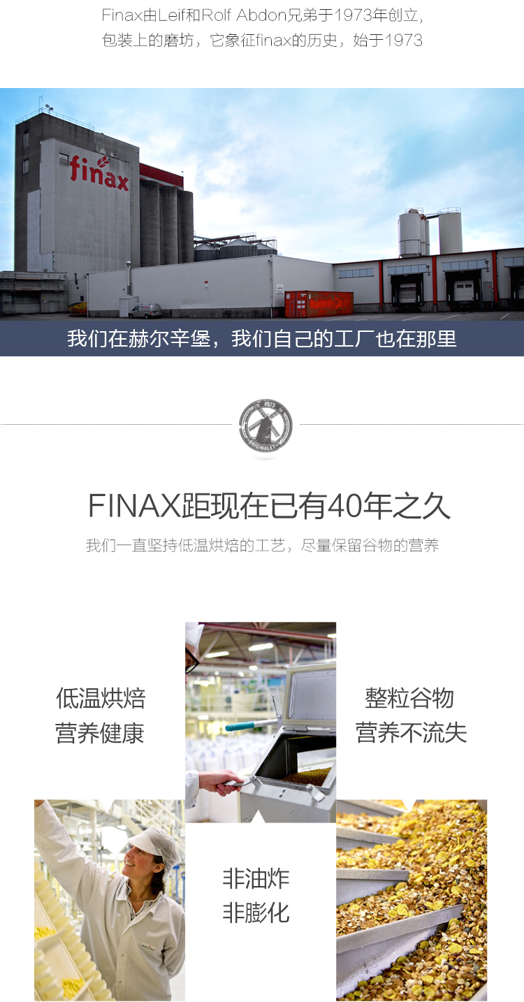 Finax的母公司Abdon集团是以麦片为核心产品的谷物食品家族企业。1973年 Leif Abdon和Rolf Abdon两兄弟在瑞典斯科纳省建造了当时全球先进的全自动磨坊,为专业的食品生产商和烘焙商提供优质、稳定的谷粉。其麦片中各种谷物均产自北欧五国,虽然成本更高,但可以从源头确保纯正品质。