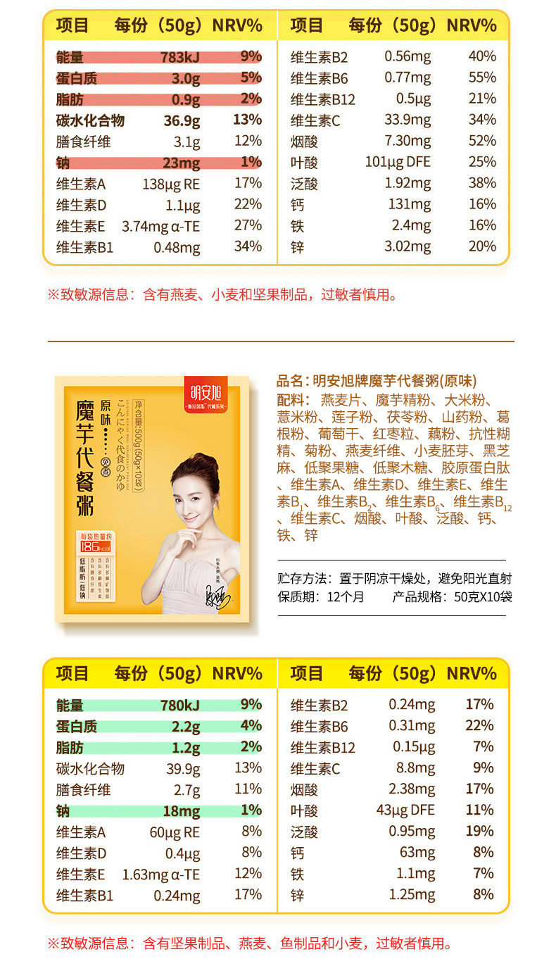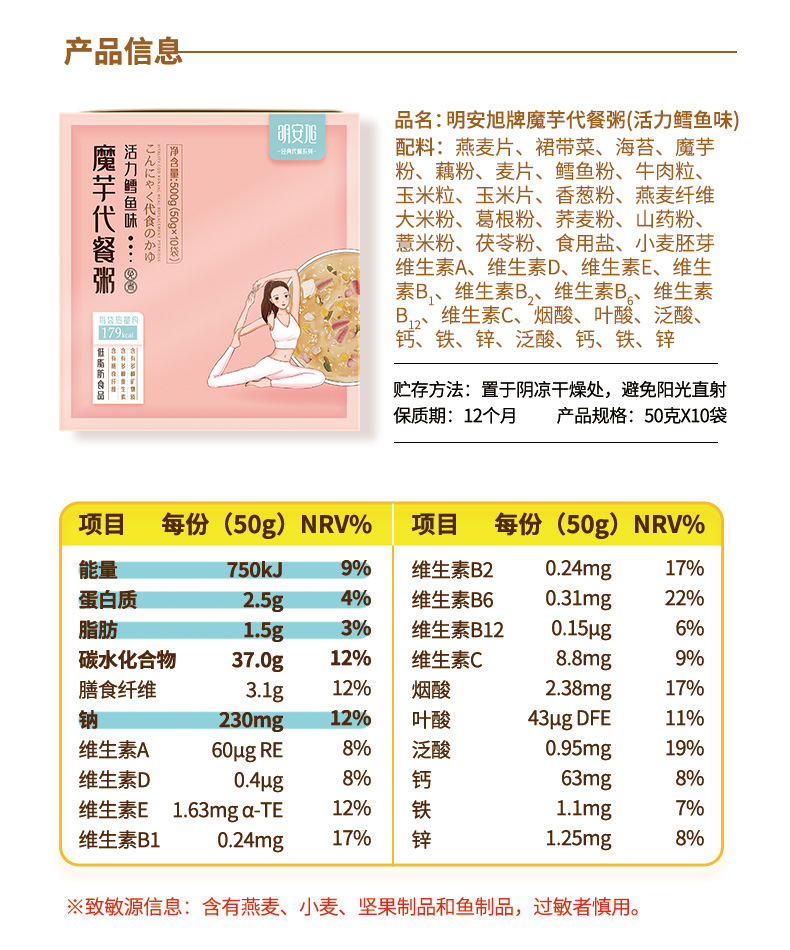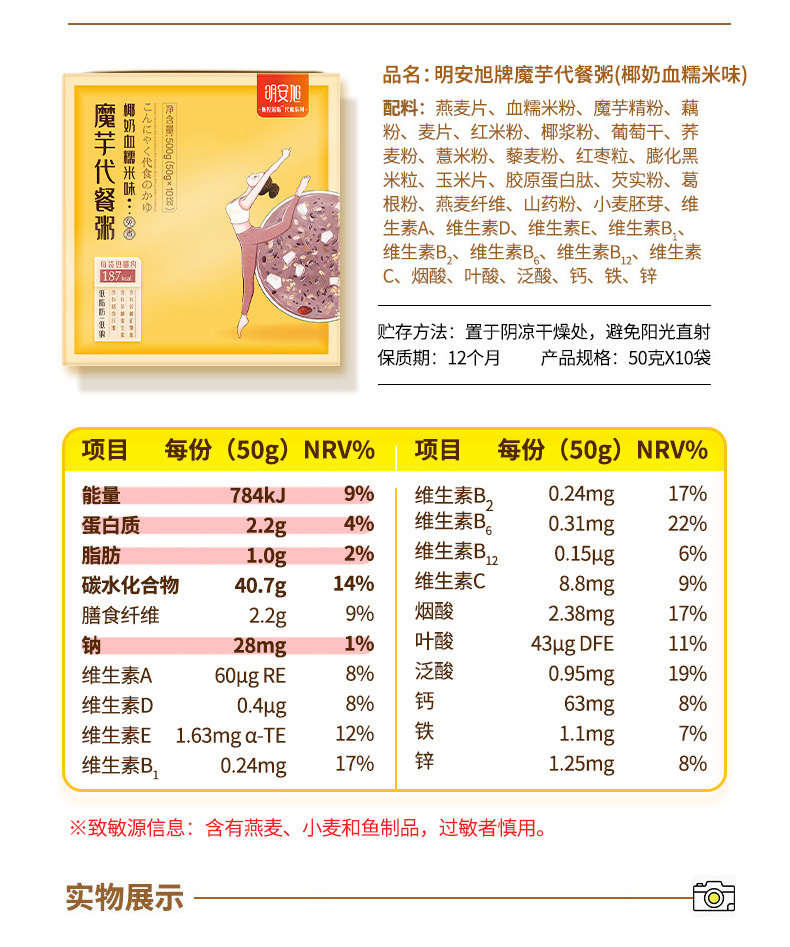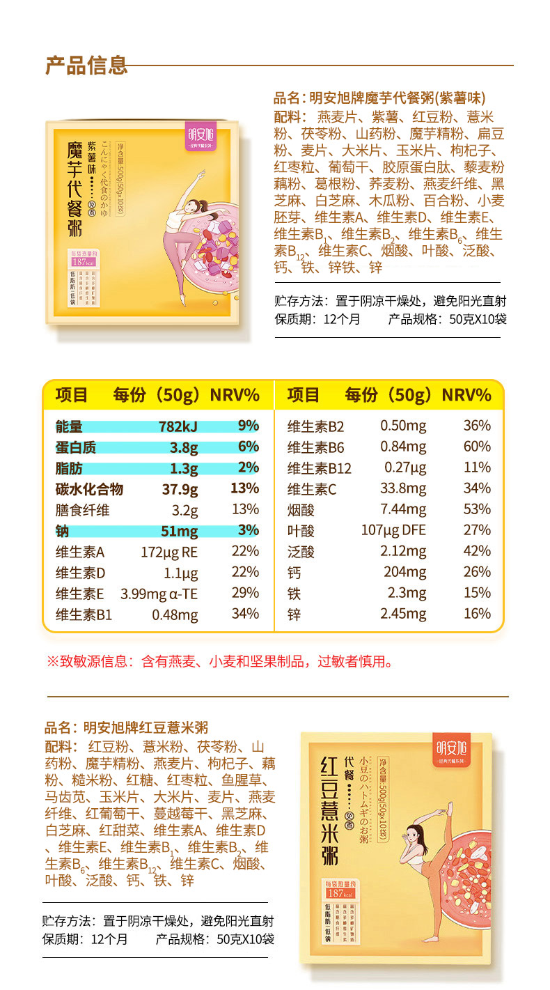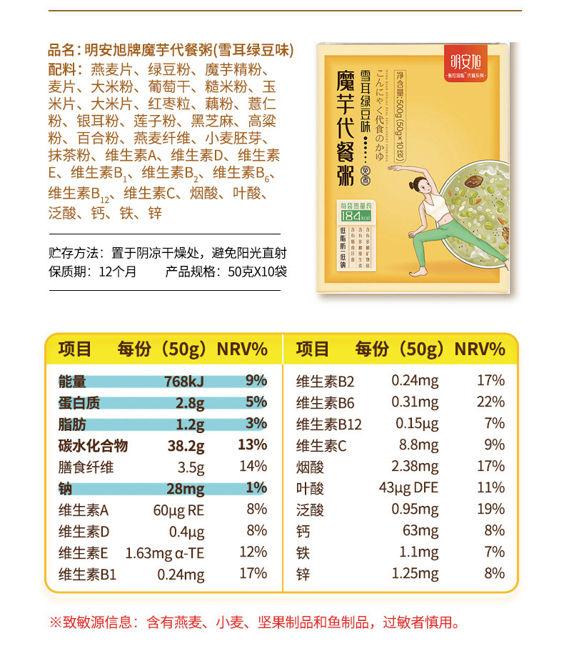 天猫明安旭旗舰店39.9元,可领30元优惠券,实付9.9元到手。吴昕代言,明安旭 魔芋代餐粥,名字虽然是魔芋代餐粥,实际上除了魔芋粉,还含有胶原蛋白微粒粉、薏米粉、红豆粉、茯苓粉、山药粉、扁豆粉、藕粉、葛根粉、燕麦片、绿豆片....等等共25种果肉五谷,科学食材配比,专为代餐研制,均衡营养,低热量摄入,饱腹感达4小时。开水冲泡即可食用,非常方便。规格:50g*10袋