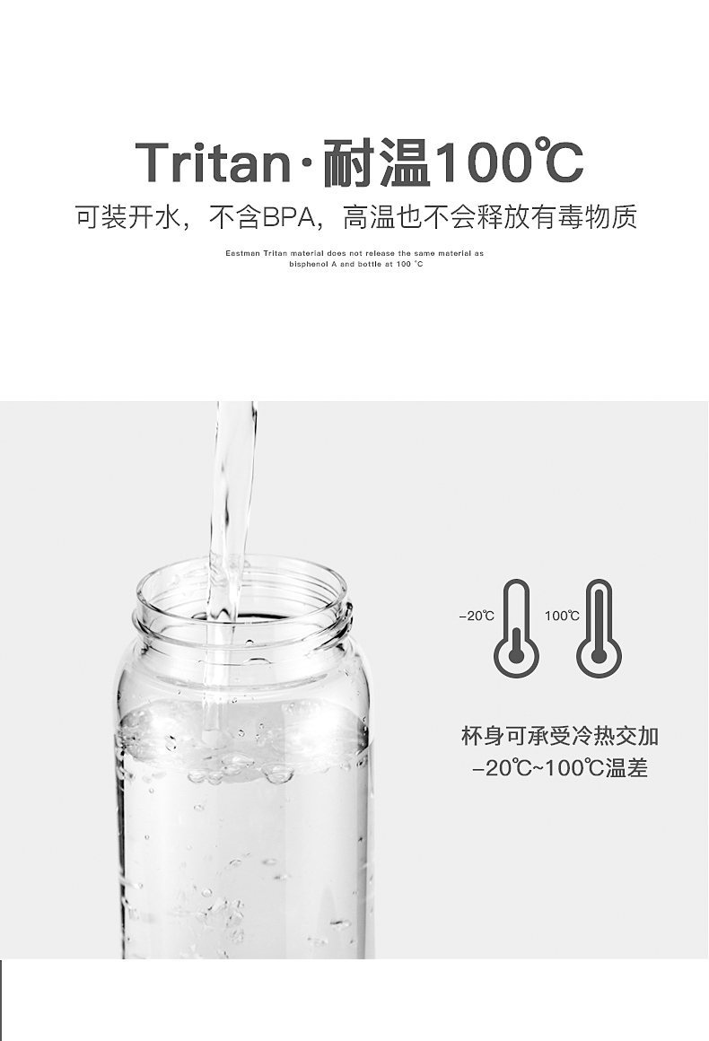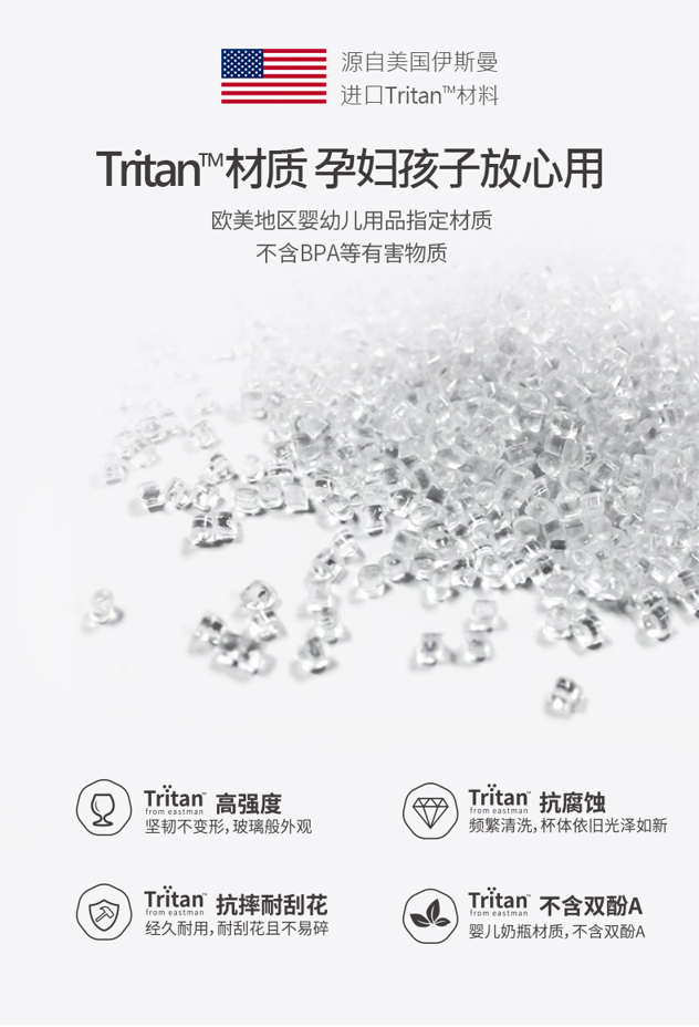 “Tritan”是目前公认最安全食品级塑料,由美国伊士曼/Eastman公司在2007年发明的。这种新型材料解决很多传统塑料的弊病,韧性好,冲击强度高,耐化学品,透明高,可耐100度沸水。关键还没有传统塑料的双酚(BPA)、双酚S(BPS),已通过FDA“美国食品药品监督管理局”安全认证。