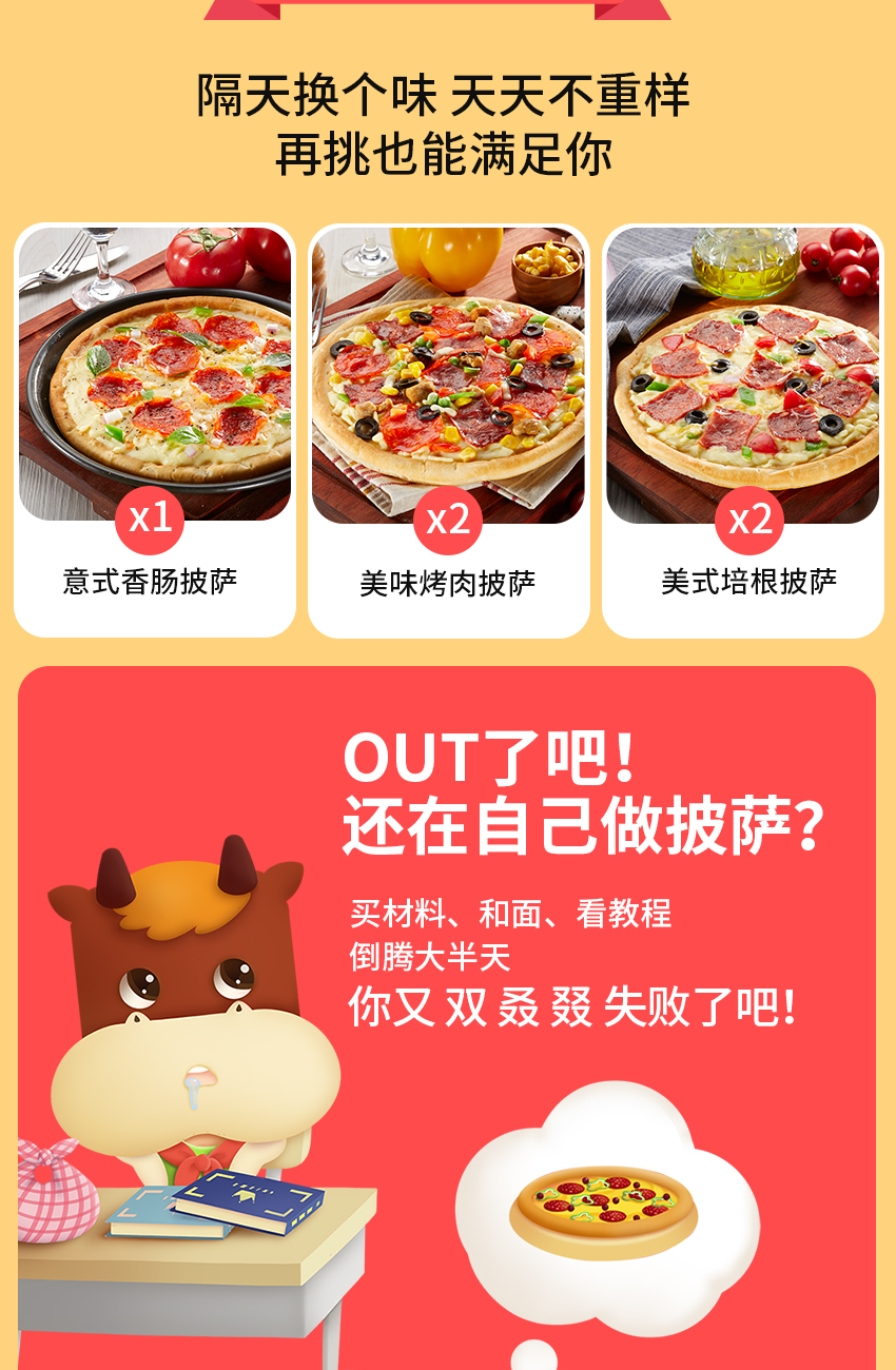 天猫小牛凯西旗舰店79元,可领20元优惠券,实付59元到手。第一款此价,火腿披萨*2、美式培根披萨*2、美味烤肉披萨1个,共发5个7寸披萨。3分钟速成。选用进口原料,浓郁芝士,新鲜番茄酱,优质饼皮再加丰富的馅料,经手工打造而成。无需多加工,烤箱、煎锅、微波炉烤熟即可。