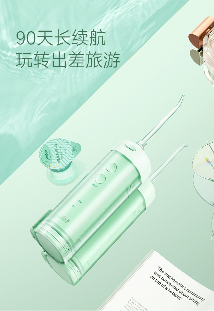 1400次/min高频脉冲,0.6mm细腻水珠,聚焦水流全方位清洁死角死缝,有5种清洁模式,在搭配4种喷嘴,适合不同人群打造专属你的清洁方案。
