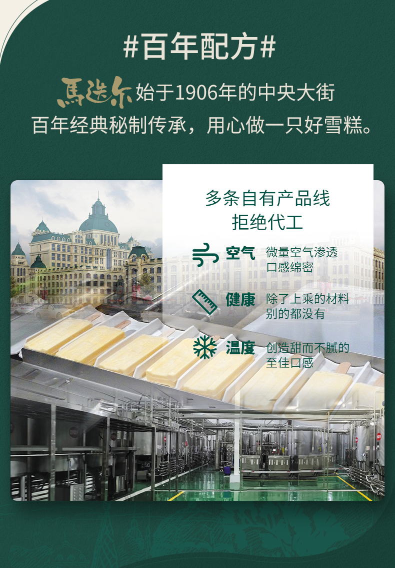 “马迭尔”是我国最早的冷饮企业之一,由俄籍犹太人开斯普于1906年在哈尔滨创建,距今有100多年的历史。“甜而不腻,冰中带香”,甄选原料、百年古法制作,入口即化,奶香纯正;且无膨化剂,其固化物(牛奶、鸡蛋等)投放比例远高于冰激凌。