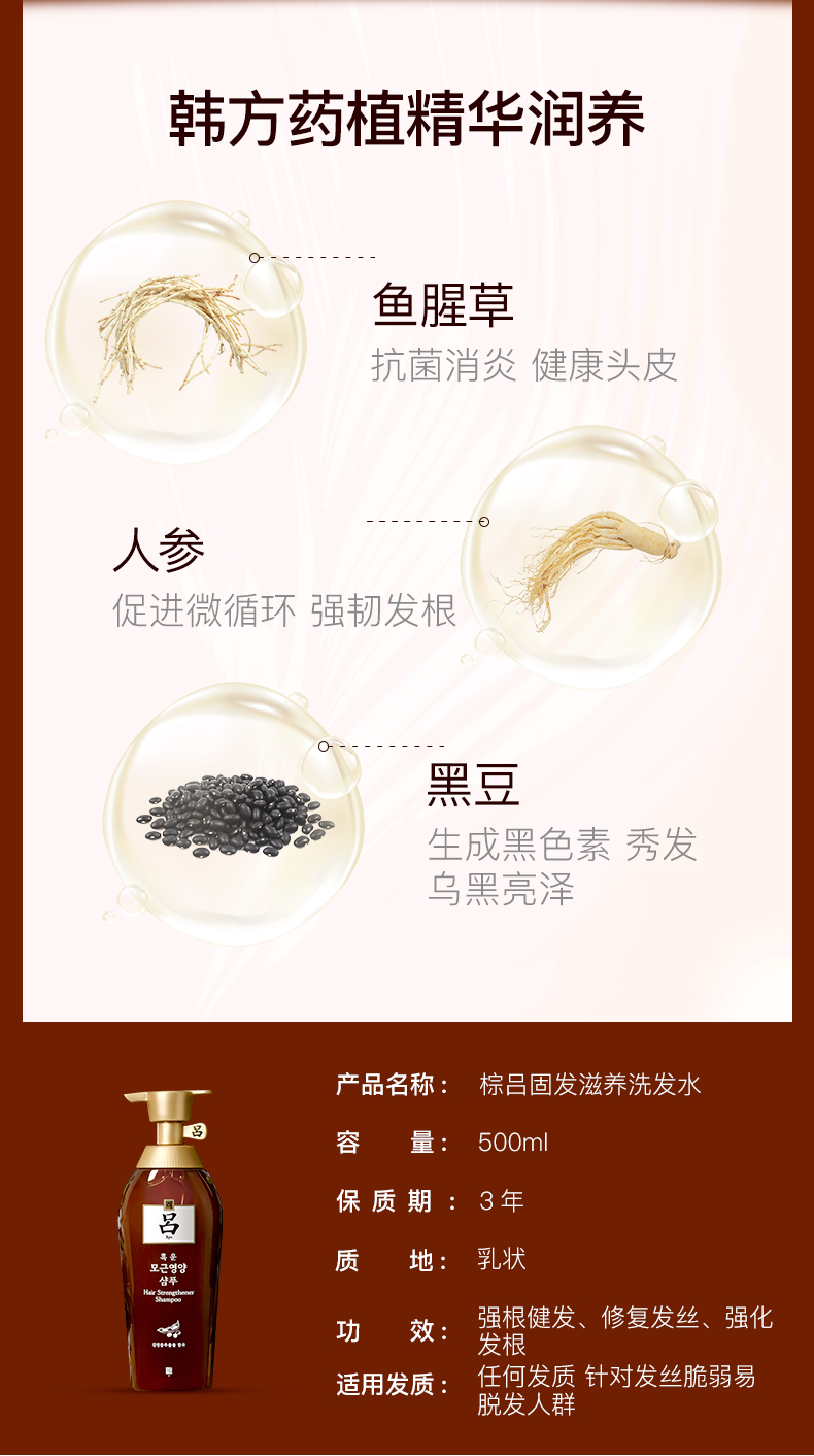 棕吕采用无农药认证的韩方配方,添加了柏子仁补气养血、强固发根;生地黄激发生发细胞;川穹活气行血;人生强固发根;红参,复脉固脱、益气摄血温和清洁、强健发根,镇静舒缓头皮、修补发丝,从发根处打造丰盈秀发。为脆弱发至提供几种营养护理。