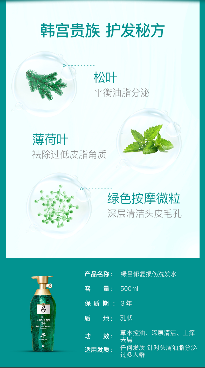 绿吕含有海藻、松叶、发酵薄荷等自然植物萃取成分,可有效清洁过多油脂及老废角质,令头皮达到水油平衡的状态。特别添加由绿茶水、莲花成分制成的绿色按摩微粒,可达到温和按摩的功效,提供更加洁净舒爽的使用感受。