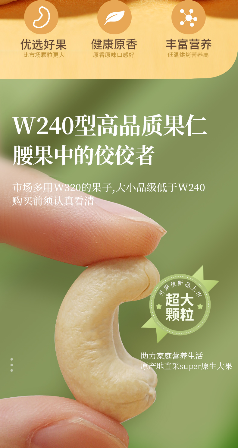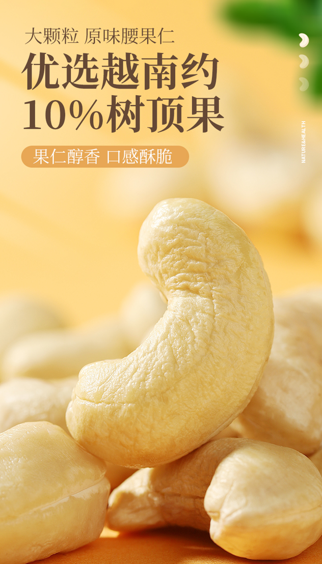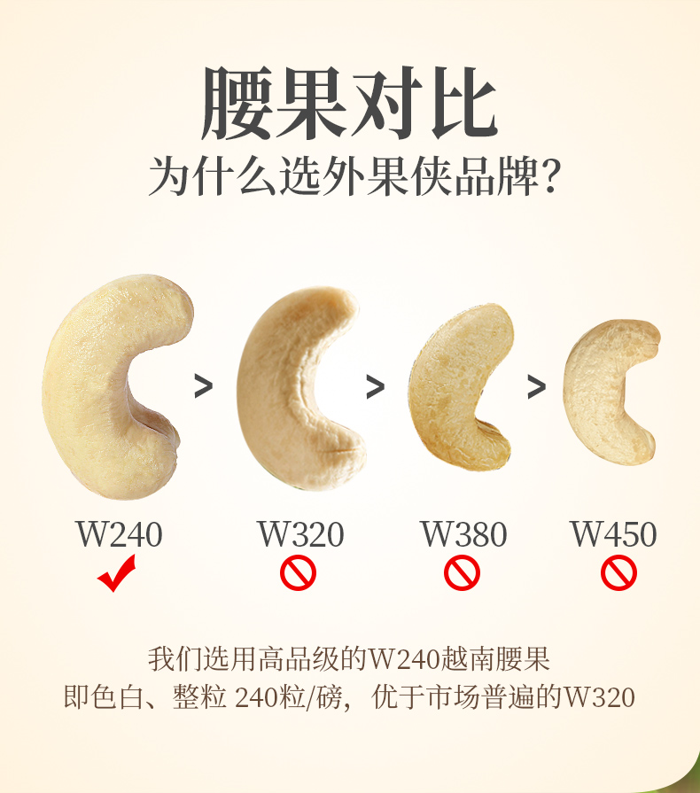 大小一般用阿拉伯数字来表示:每磅有多少粒,数字越小的腰果越大,但也不是死规定,可以上下浮动约20粒。