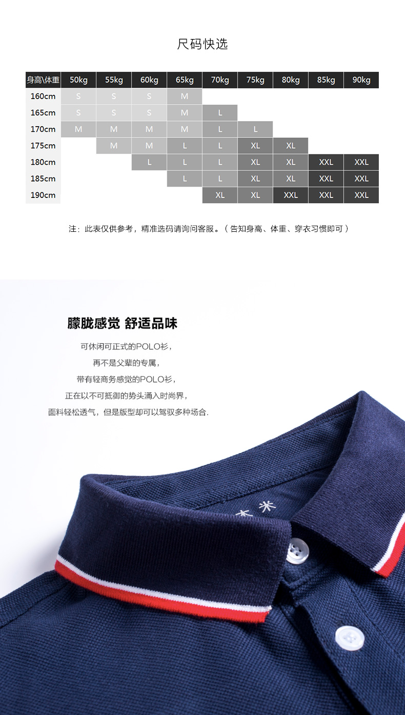 本米男士polo衫,目前只做了深蓝色一款,领口和袖口红、白、蓝撞色,休闲轻商务,不是太正式的场合都能穿,面料为100%美国皮马棉,珠地网眼结构,比普通针织布更透气、透湿、干爽及更耐洗,夏天穿舒适又好打理。