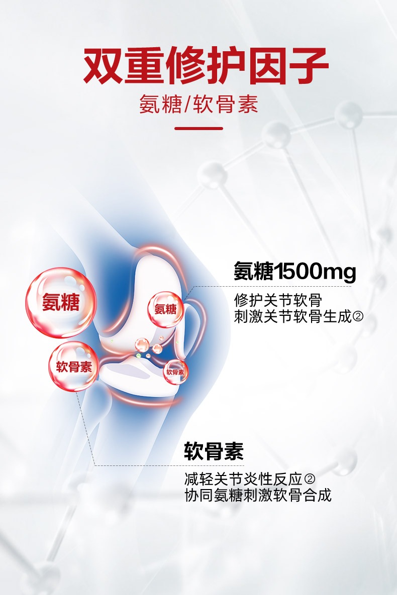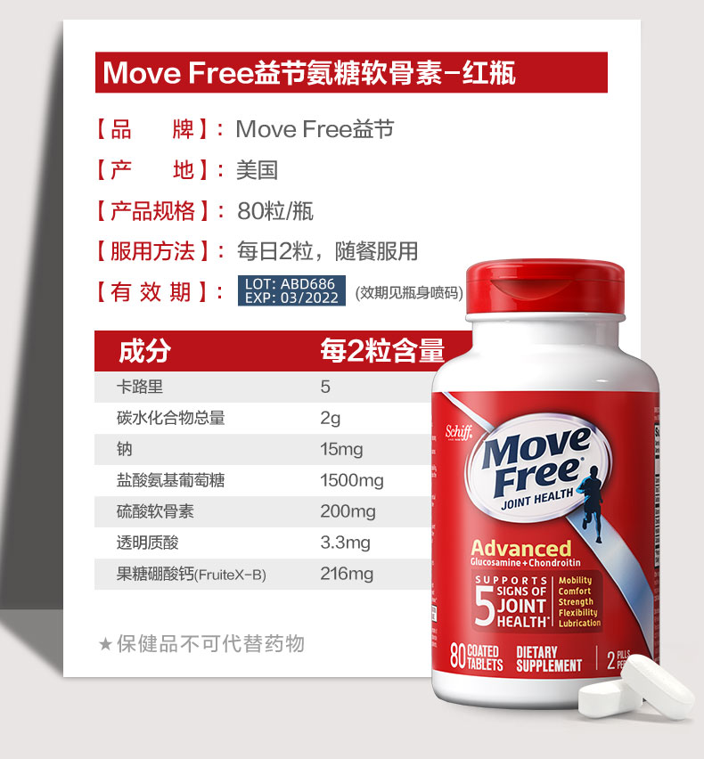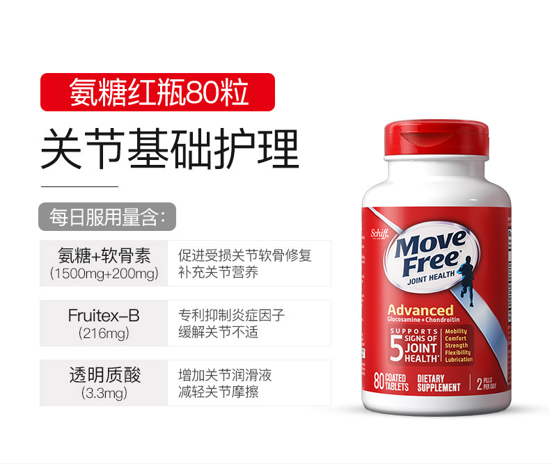 这款维骨力 氨基葡萄糖软骨素,是红盒,美国原产,作用是强化骨质骨骼,修补软骨组织,恢复关节活力,适用于关节轻度疼痛、运动损伤、劳动损伤的人,对于腰椎、手腕/关节、踝关节、膝关节、肘关节、颈椎均有效果;每日2粒,1次或多次随餐服用,规格是80粒/瓶。