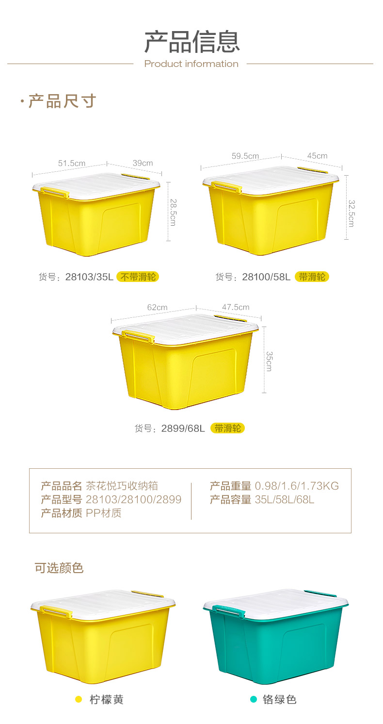 茶花,中国驰名商标,中国家居塑料制品行业龙头企业。采用PP材质,坚韧耐用,做工精致,无毛刺,可收纳棉被、大衣、毯子等,箱底配备4个内嵌可拆卸滑轮,叠加存放更稳定,受力均匀。