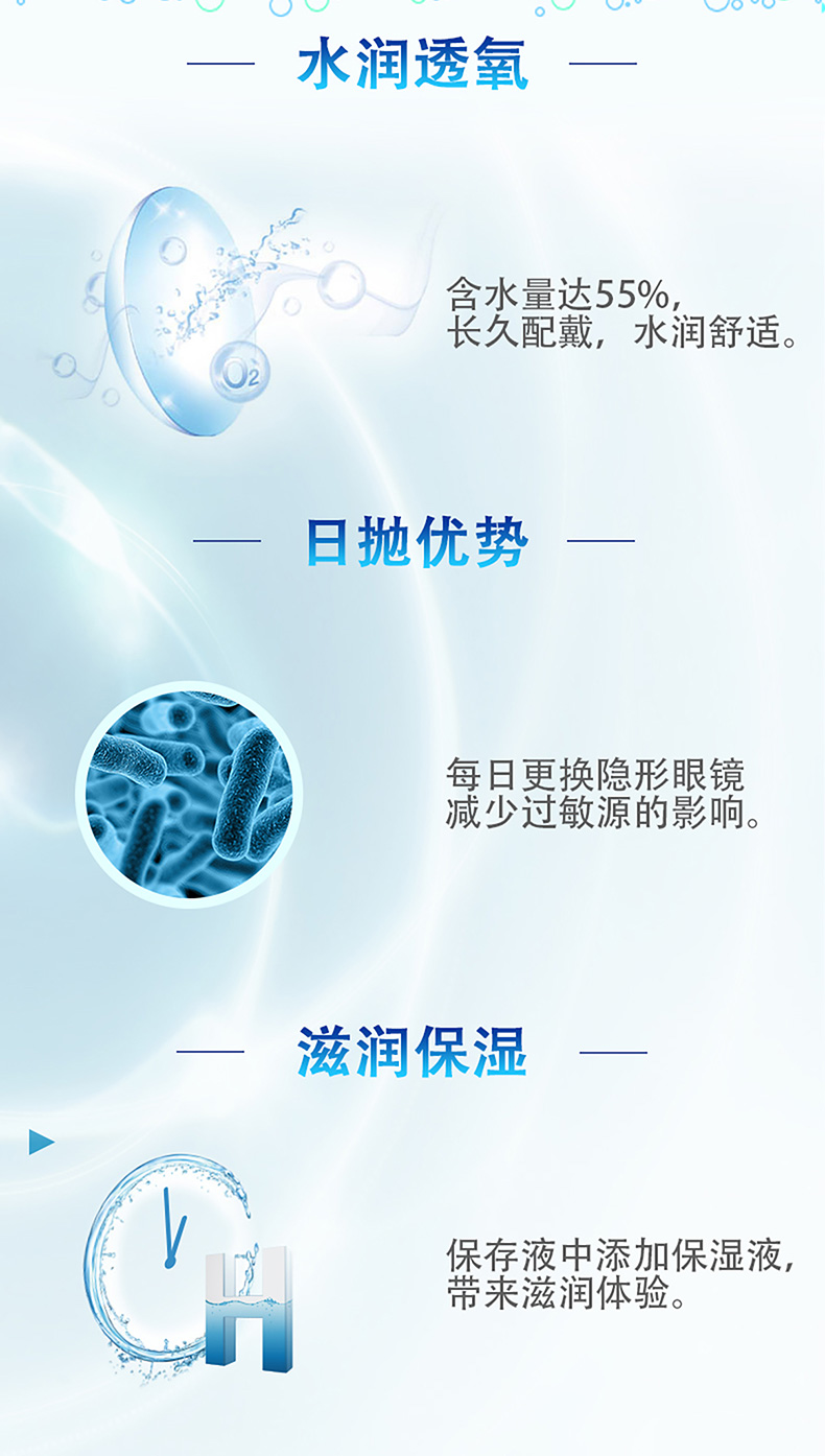 这款隐形眼镜中心厚度只有8.7mm,含水量高达52%,高效缩水,去干涩;添加紫外线吸收剂,能够有效阻挡70%的UVA以及96%的UVB,时刻保护眼睛,更周全。