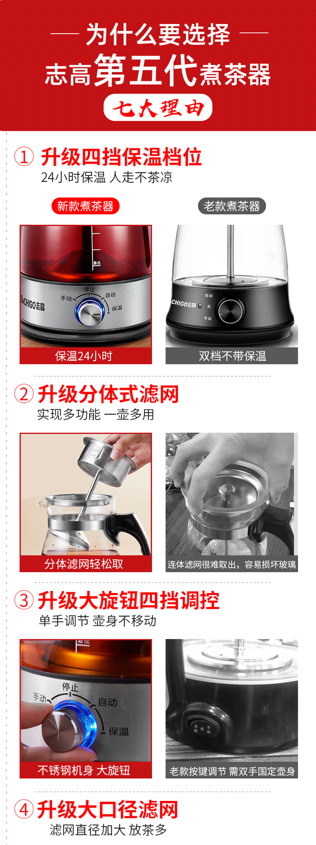 滤网使用稳固三脚卡槽,有效聚拢蒸汽,深度渗透陈年老茶,更好释放茶香。过滤网使用外提式设计,提手处有橡胶塑料包裹,可直接拿起避免烫伤。
