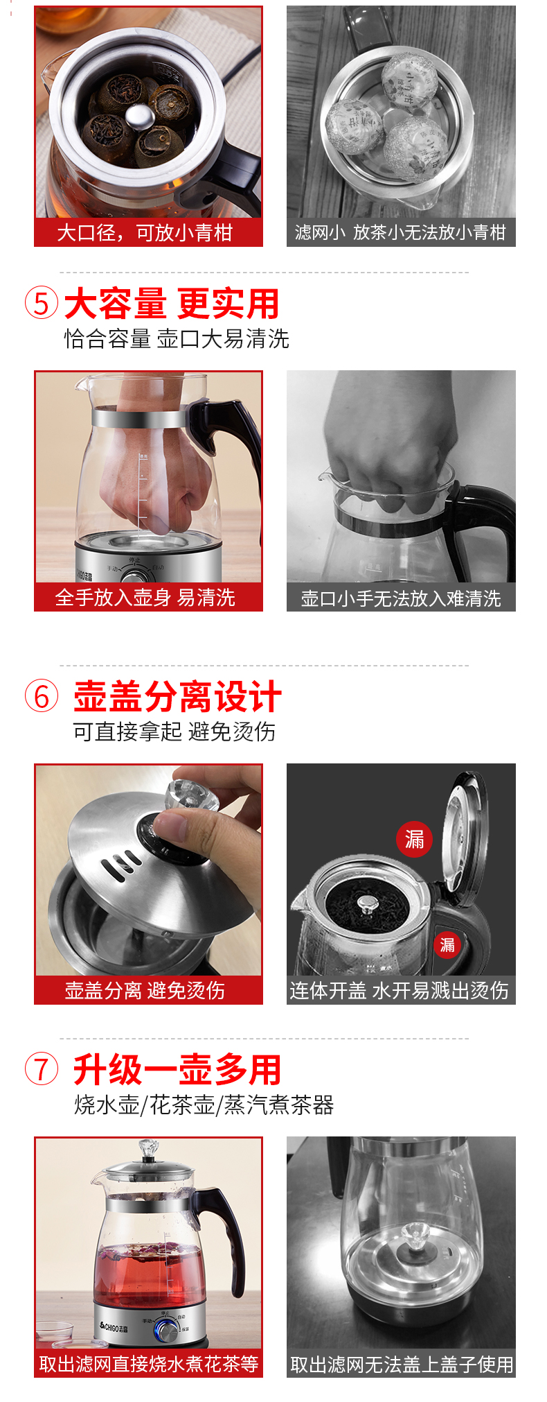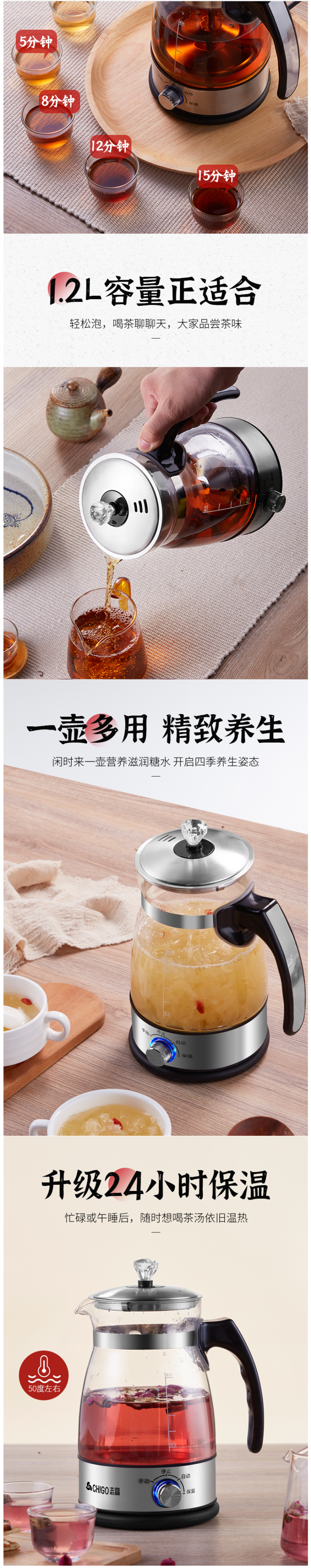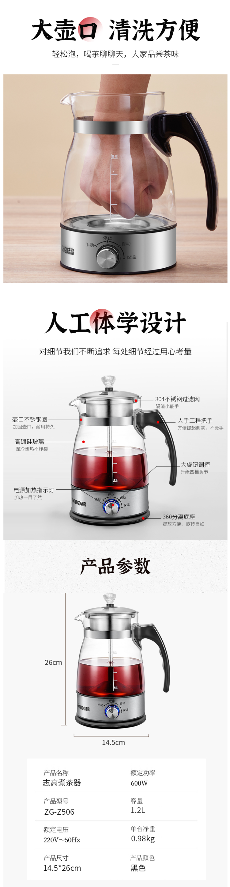 壶口尺寸大,方便日常清洗。温度过高或水烧干自动断电,双重安全保护。1.2L容量,适合3-5人使用,适合黑茶、普洱、小青桔、白茶、红茶、等品类茶叶蒸煮饮用。