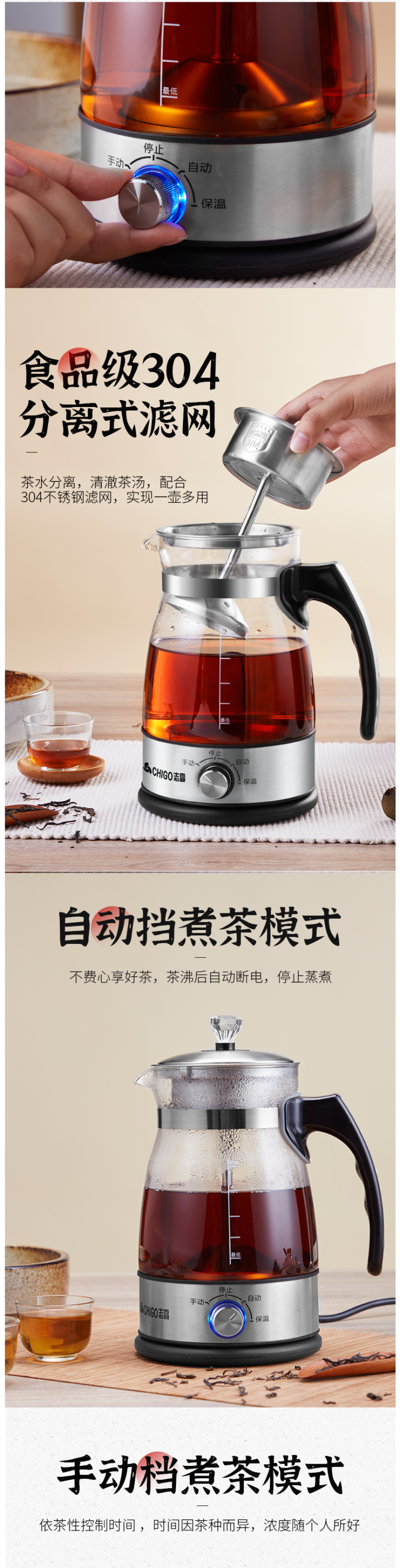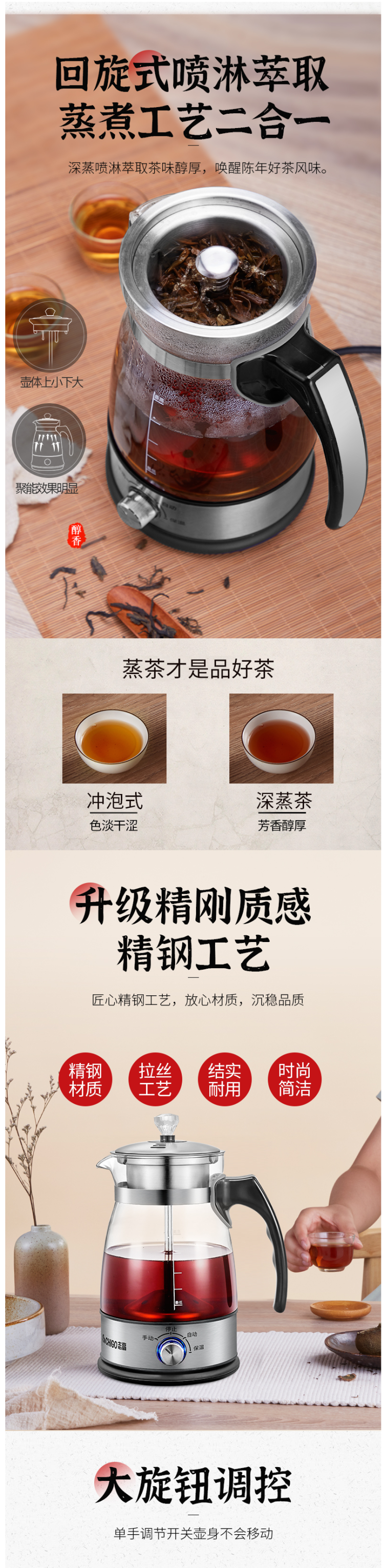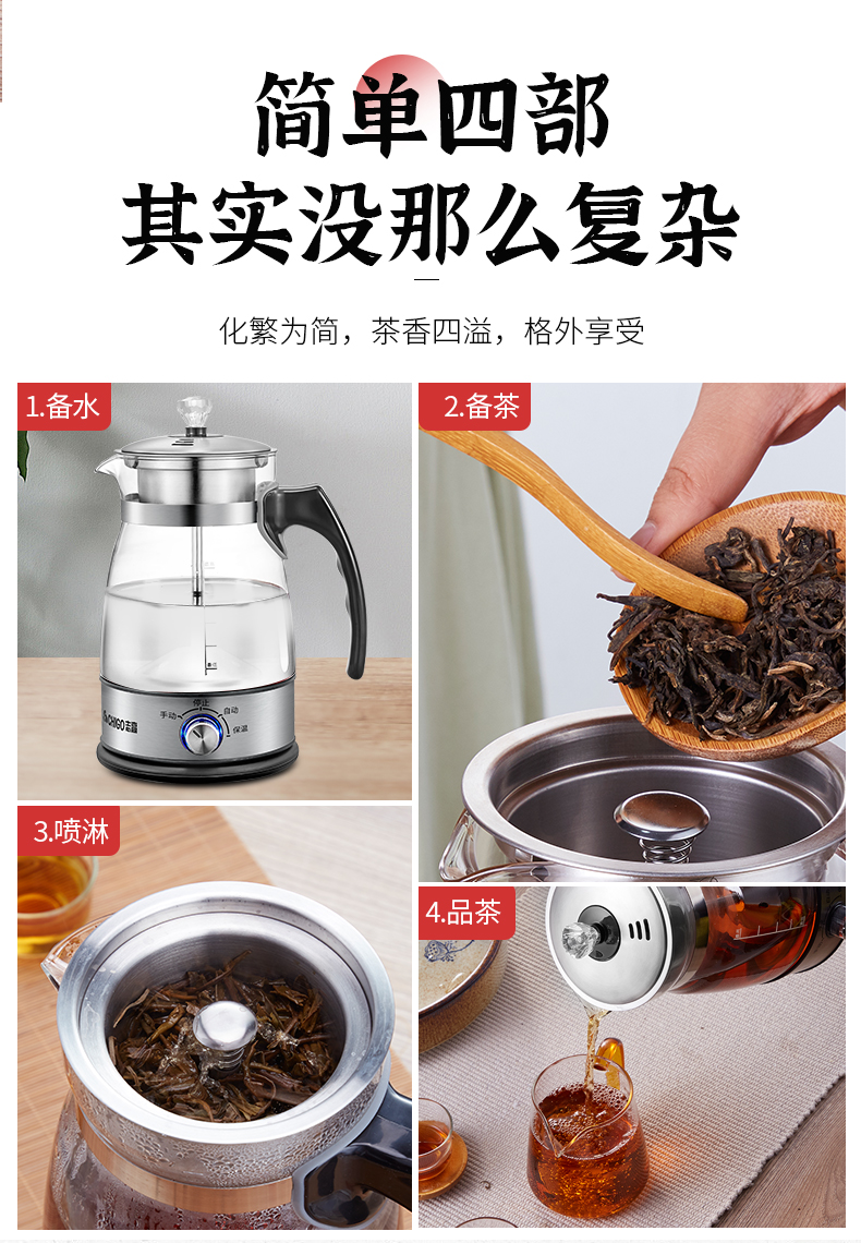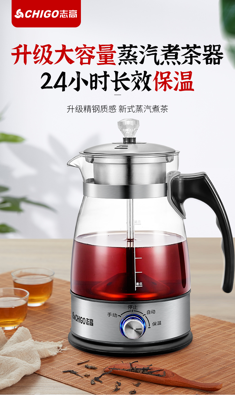 这款志高 全自动蒸汽煮茶器,不同于平时的水煮茶,其主要原理是通过密闭回旋式喷淋萃取+蒸煮二合一,沸腾的水和蒸汽,通过导管引至滤网,循环喷淋并渗透茶叶,释放茶叶营养,还原自然原香。