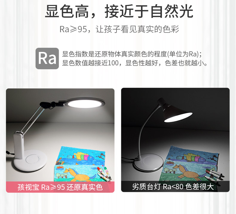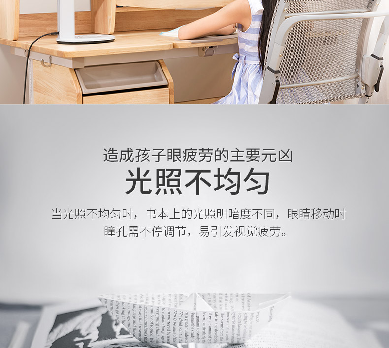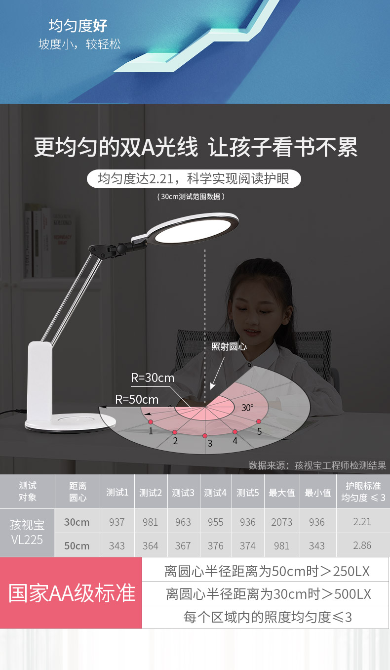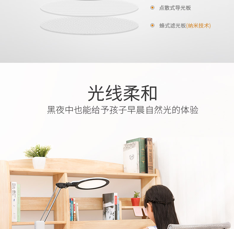 这款是孩视宝的新升级款,光源的发光直径高达18cm,光源漫射,并不会直射,具有双A级的护眼标准,最底层增加点散式导光板和纳米蜂式滤光板,多级过滤光线,减蓝光,不刺眼,照度的均匀度高达2.21,看书眼睛不累。