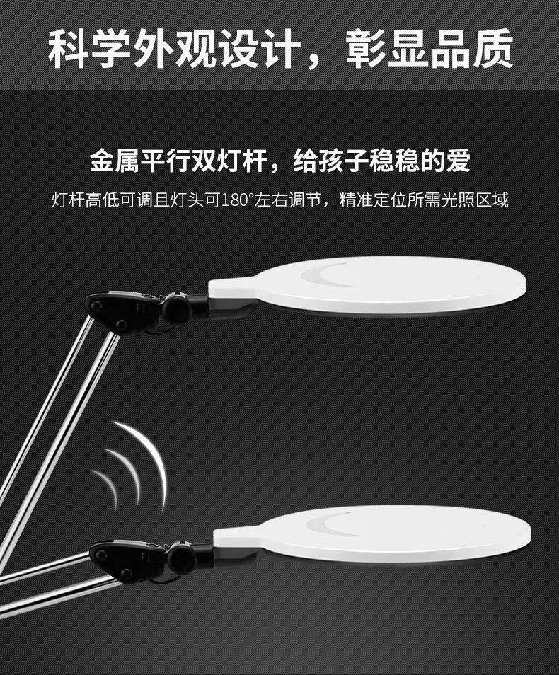 灯光明亮均匀,显色指数≥95,照射彩色物体时更接近自然光,色差小,自带金属平行双灯杆,高低可调且灯头可180°左右调节,能更精准的定位光照区域,底部有触摸式无极调光开关,可实现从10%到100%的明暗度调节,使用方便,台灯经过国家检测,无辐射、无频闪、无蓝光,使用安全健康。