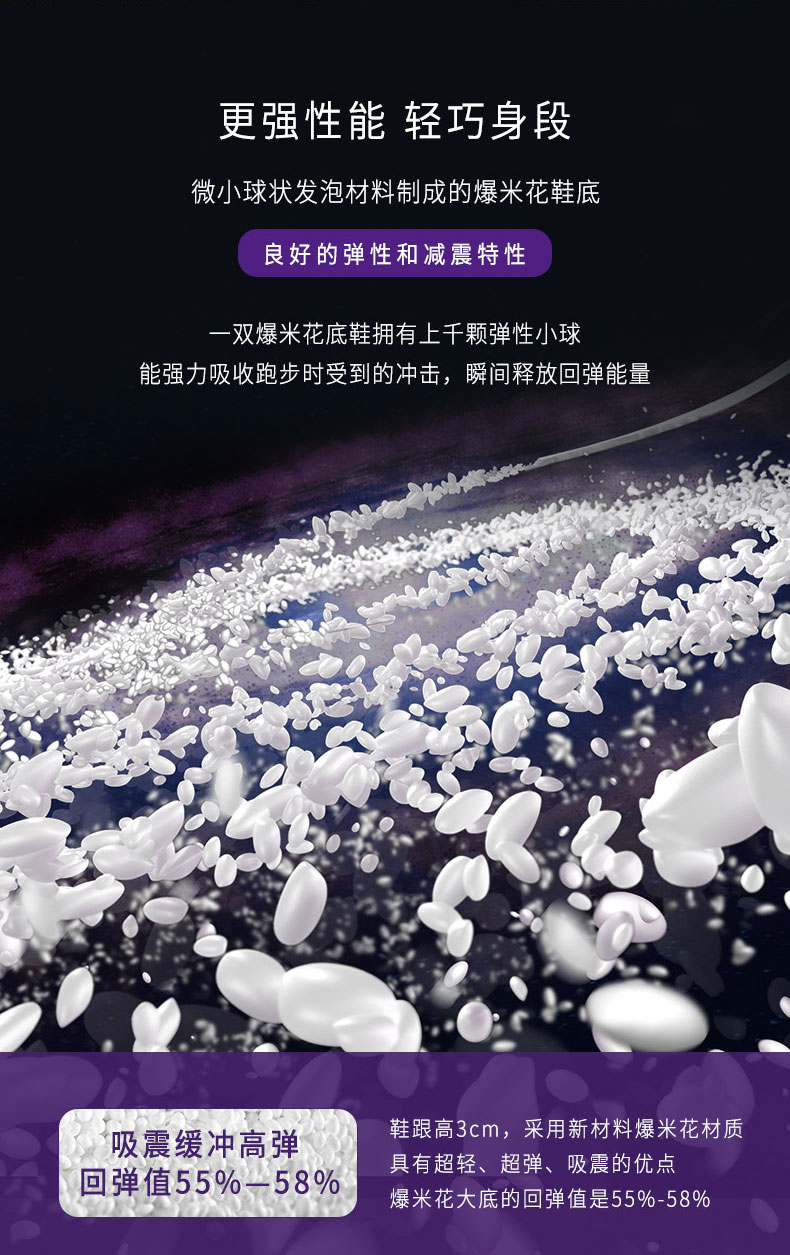 必迈Pace系列定位偏潮鞋的休闲跑步鞋,Boom「大爆炸」是目前旗舰款,款式与耐克吕布很像,鞋底是TPU发泡材质,这种材质和阿迪达斯Boost基本一样,在缓震的基础上带来轻盈灵敏回弹的脚感,简单的理解就是Q弹脚感。