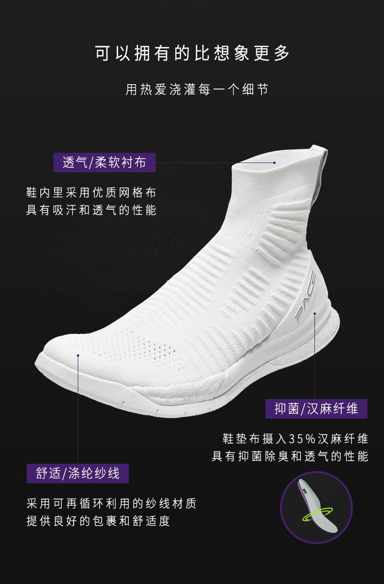 鞋面使用一体编织高弹力150D纱线,袜套款式,包裹感觉到位,得益于针织网眼结构,鞋面高度透气。同时鞋垫的衬布,也混有35%的汉麻纤维,是一种舒爽抑菌的材质,天热穿不捂脚,异味也比平常运动鞋小很多。