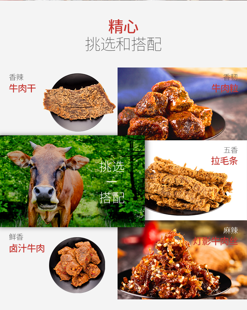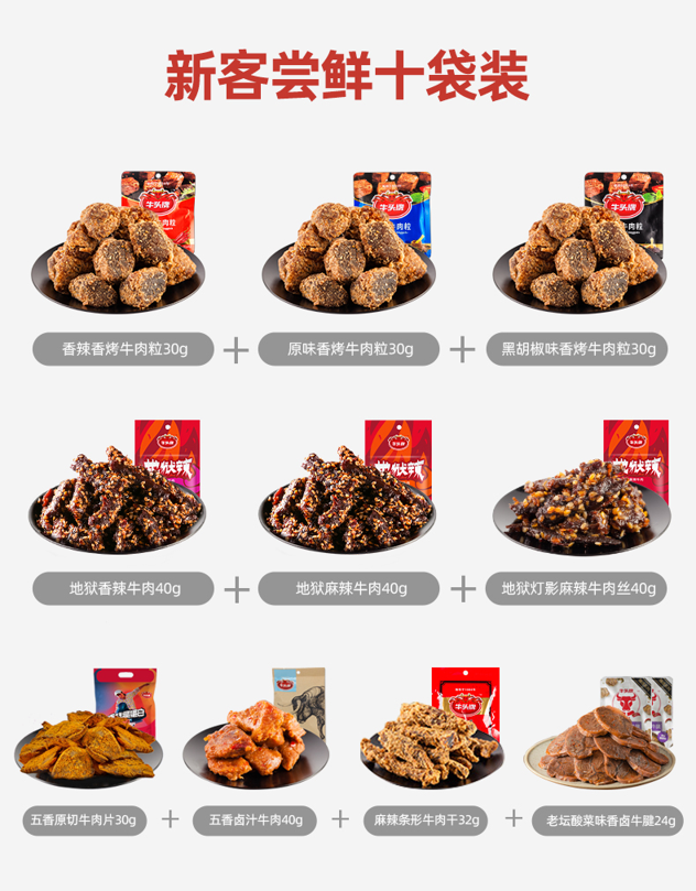 五香原切牛肉片 30g+五香卤汁牛肉 40g+麻辣条形牛肉干 32g+老坛酸菜味香卤牛腱24g
