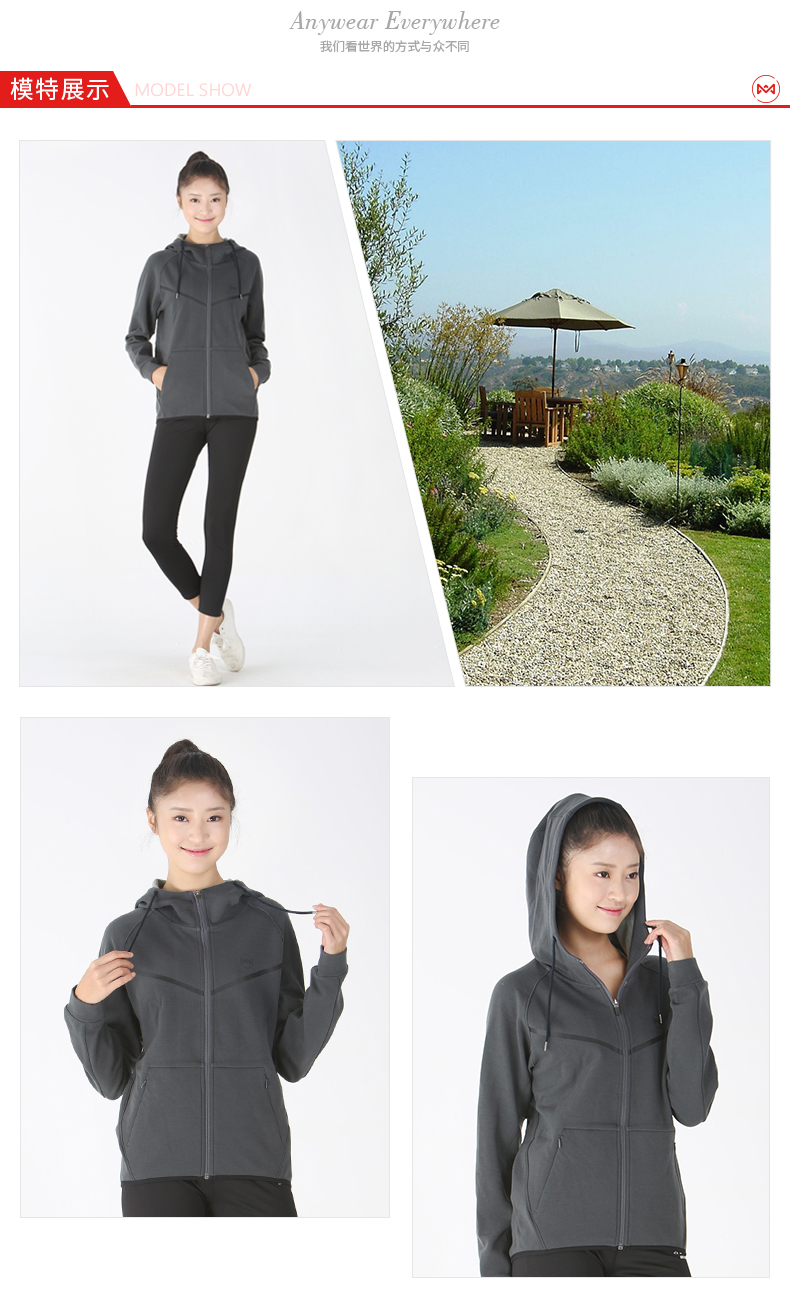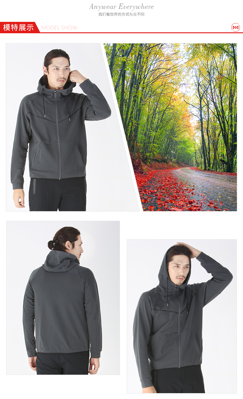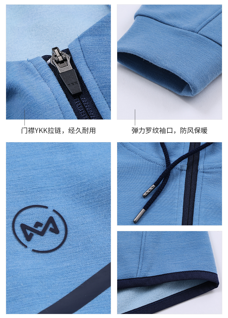 在款式和细节上,修身版型,一体连帽开衫卫衣款式,插肩袖设计,前胸还有覆彩膜,使用YKK拉链,面料接缝处用的是四针六线工艺,减少与肌肤的摩擦,袖口和下摆的缝纫也很平滑。