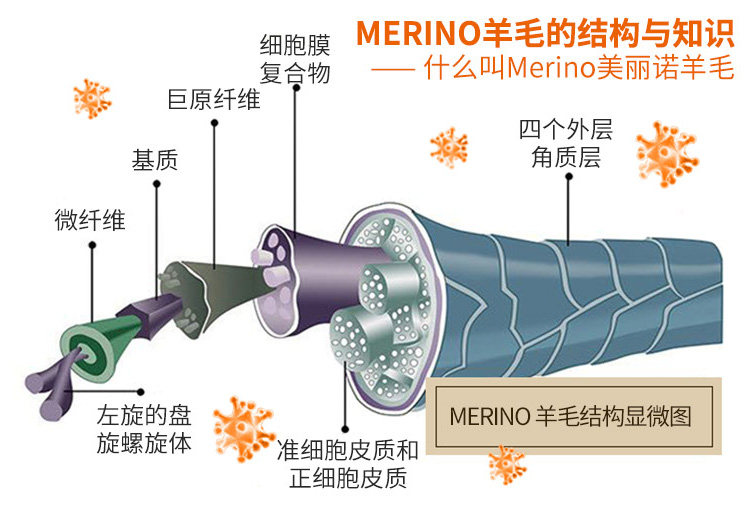 美利奴羊毛比普通羊毛纤细,更暖更暖,手感顺滑柔软,它是一种蛋白纤维,弯曲的结构透气极好,能吸收大量水蒸气并快速挥发,天然抑菌抗臭,能根据体温变化产生反应,给人舒适恒温之感,冬天穿温暖不捂汗,夏天穿吸汗干爽。是高端保暖内衣、运动装、冬靴、袜子等使用的面料。