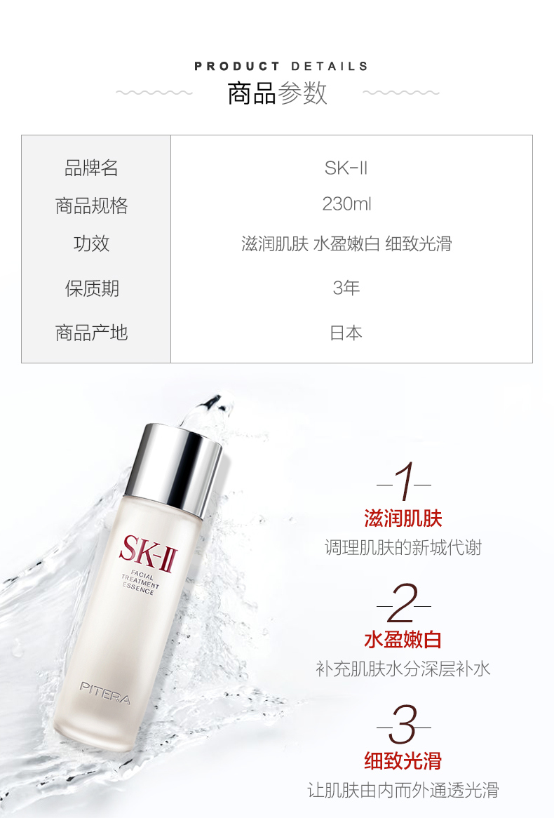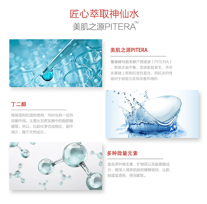SK-II神仙水含有高达90%以上的富含多种营养成分的PiteraTM酵母精华。每天为肌肤提供充足营养并调理肌肤,深层保湿,平衡肌肤的pH值,塑造润泽光洁的肌肤本色。 PiteraTM提升五大美肌维度,让肌肤升华至晶莹剔透:
